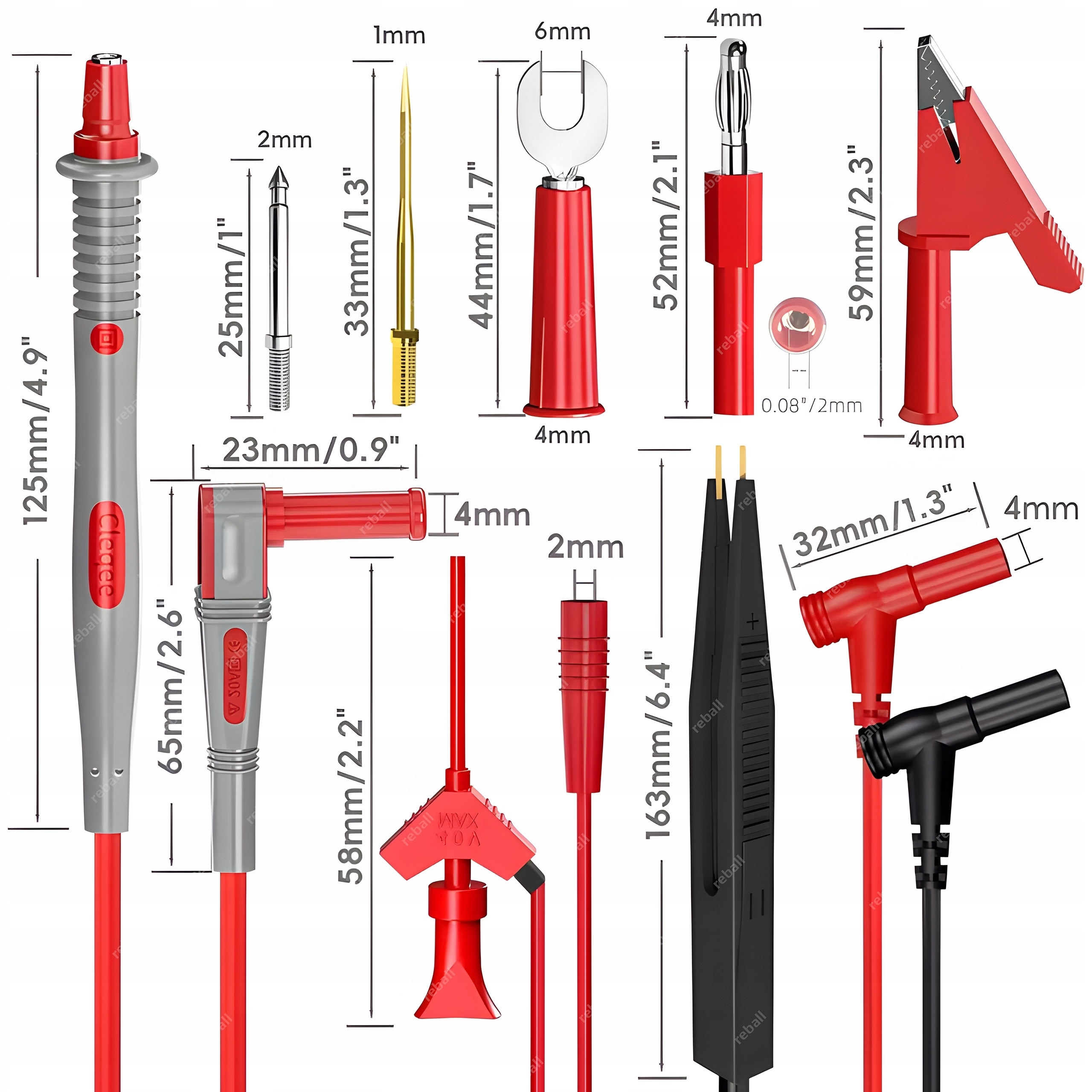 Ten wszechstronny zestaw zawiera przewody pomiarowe, sondy, wtyczki i zaciski, które są niezbędne dla profesjonalistów i pasjonatów elektroniki.