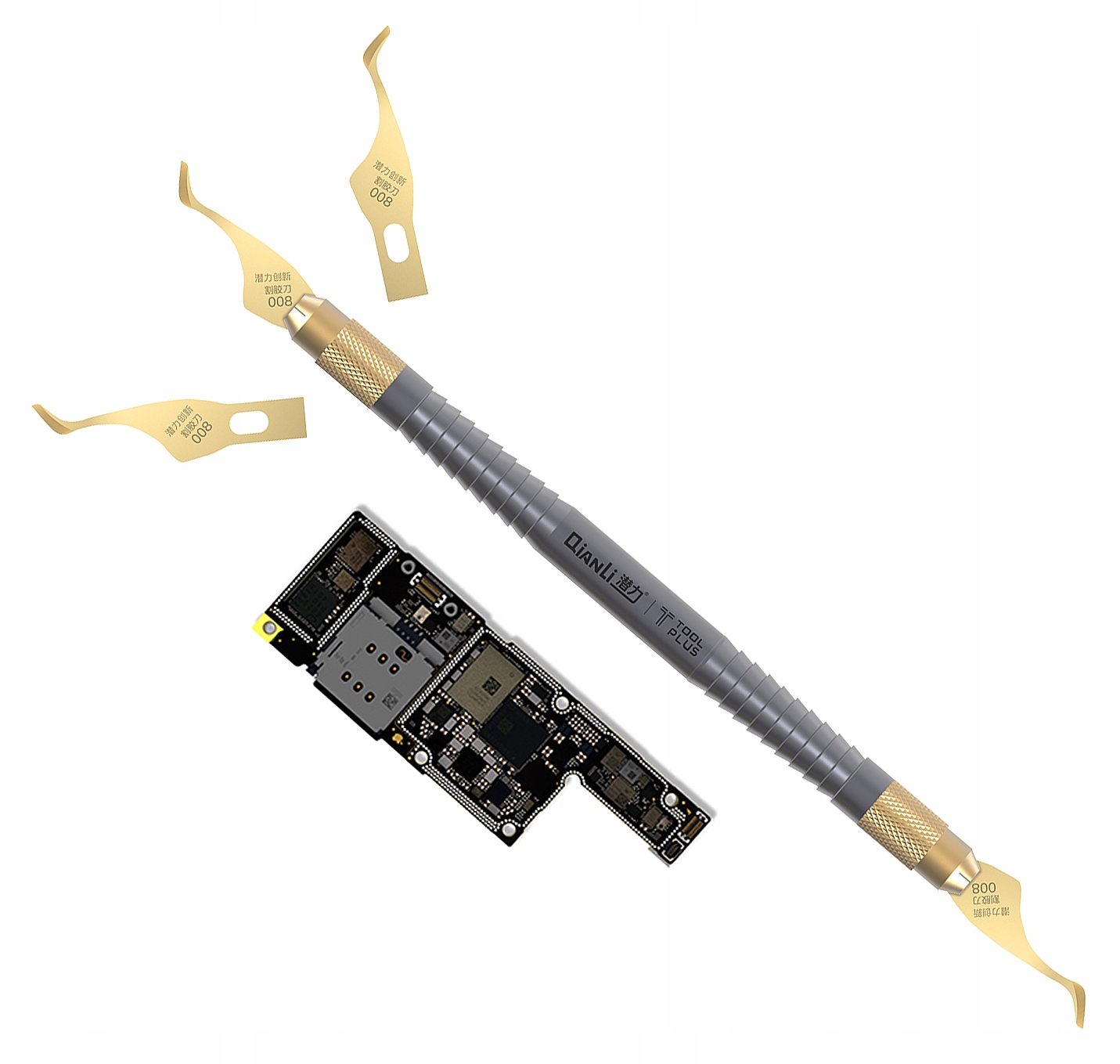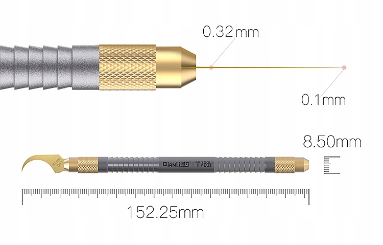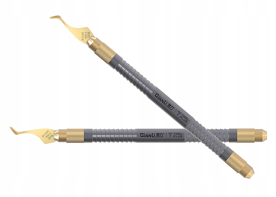 Dwustronny skalpel QIANLI 008 przeznaczony do usuwania kleju OCA z ekranów LCD podczas procesu naprawy oraz separacji i podnoszenia układów BGA, SMD, CPU, GPU, MPU z PCB.