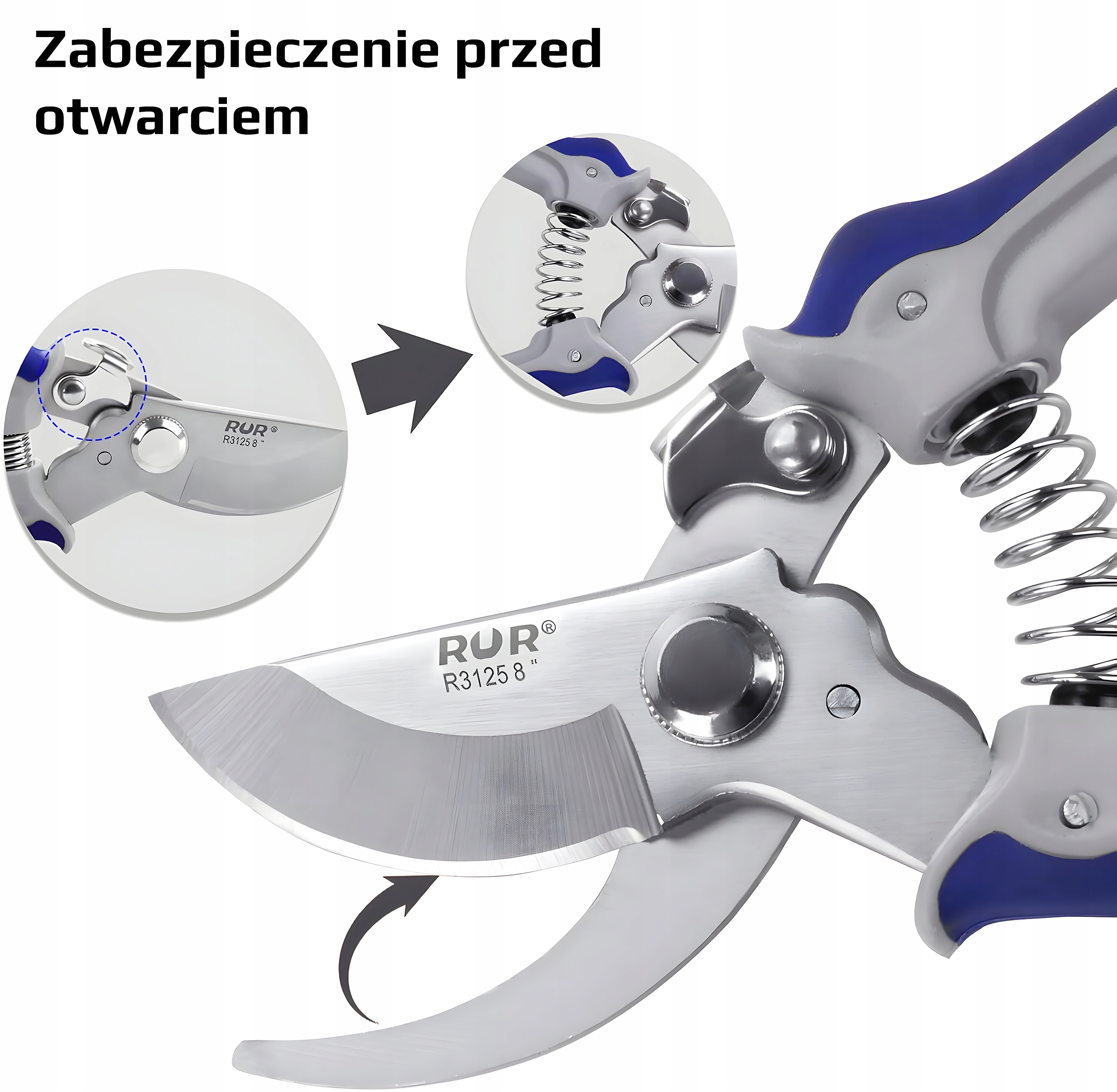 Sekator otwiera się i zamyka po delikatnym naciśnięciu/zwolnieniu blokady palcem jednej ręki.