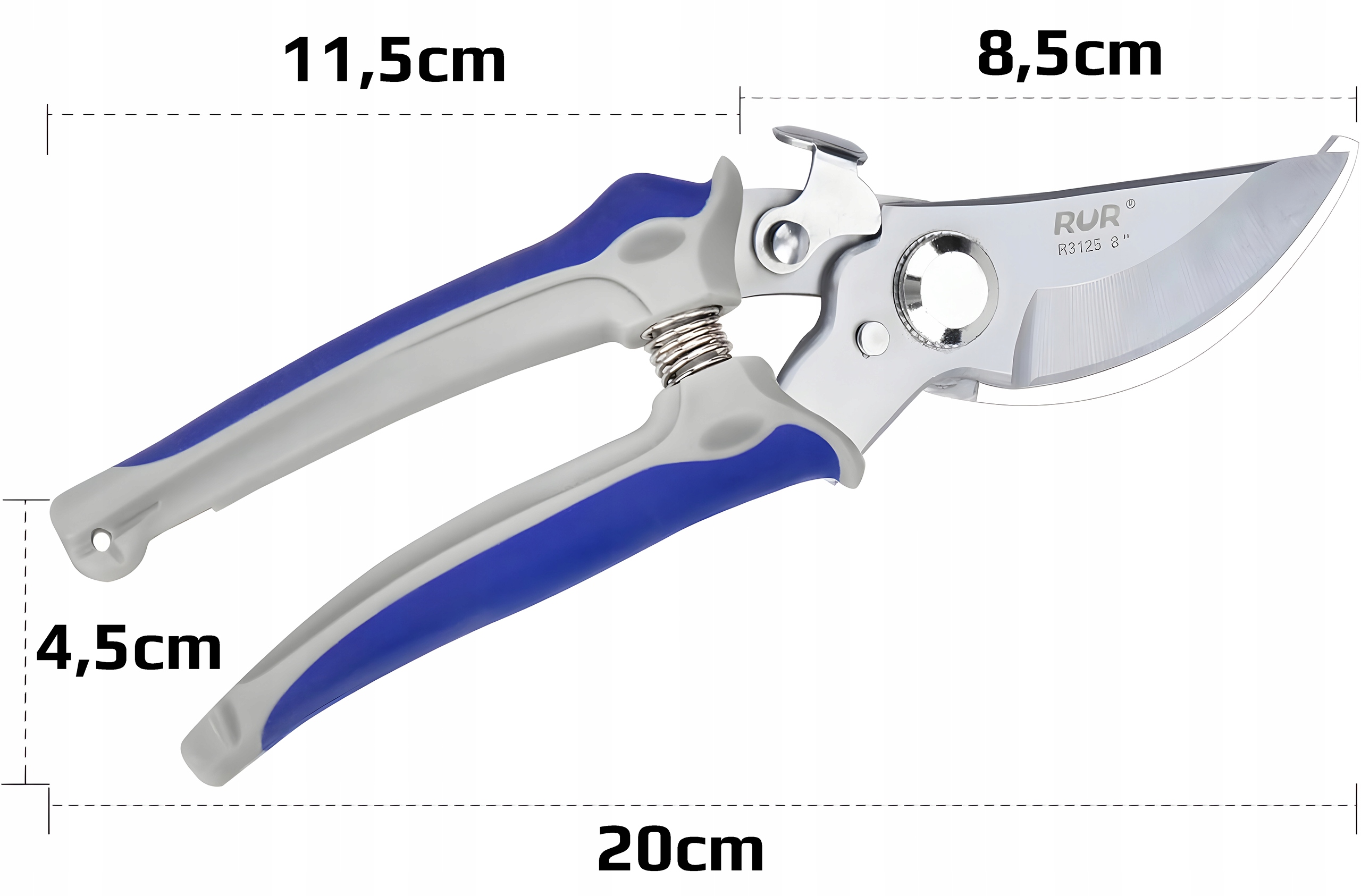 Długość całkowita sekatora wynosi 20cm w najdłuższym punkcie, co sprawia, że jest on wygodny w użytkowaniu, zarówno podczas precyzyjnych cięć, jak i prac długotrwałych.