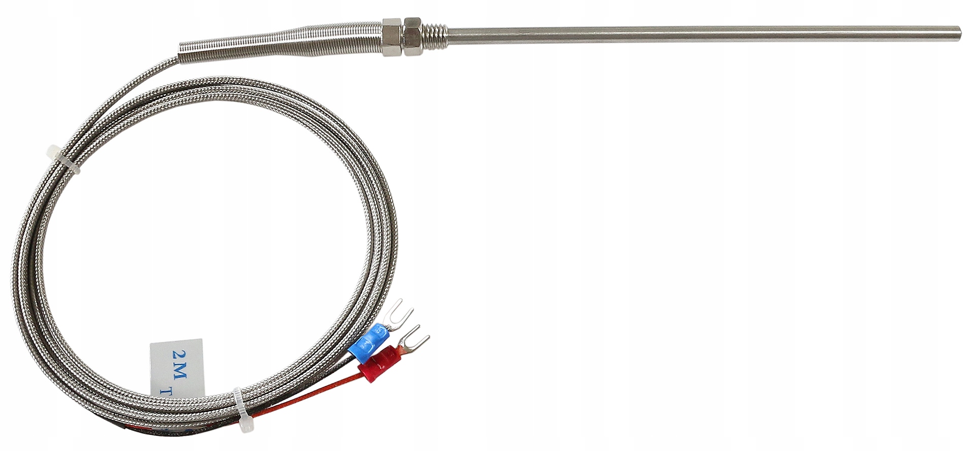 Czujnik temperatury typu K umieszczony wewnątrz osłony ze stali nierdzewnej zakończonej gwintem M8 z przewodem o długości 2m.
