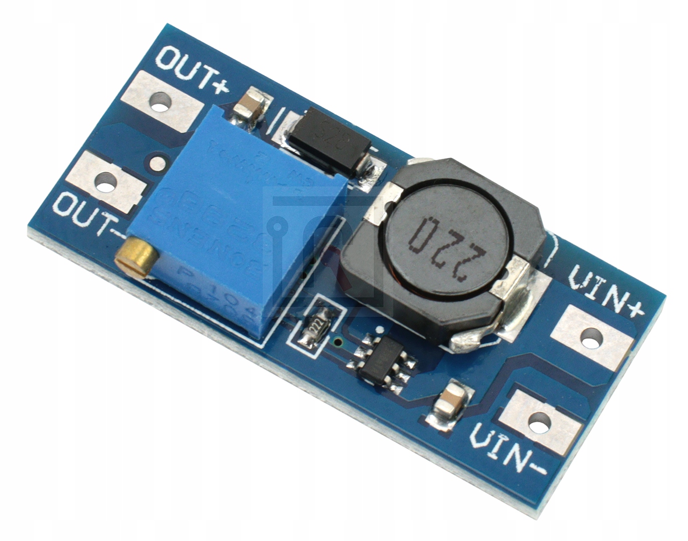 Moduł impulsowej przetwornicy napięcia DC-DC typu Step-Up podwyższającej napięcie wejściowe na wyjściu.