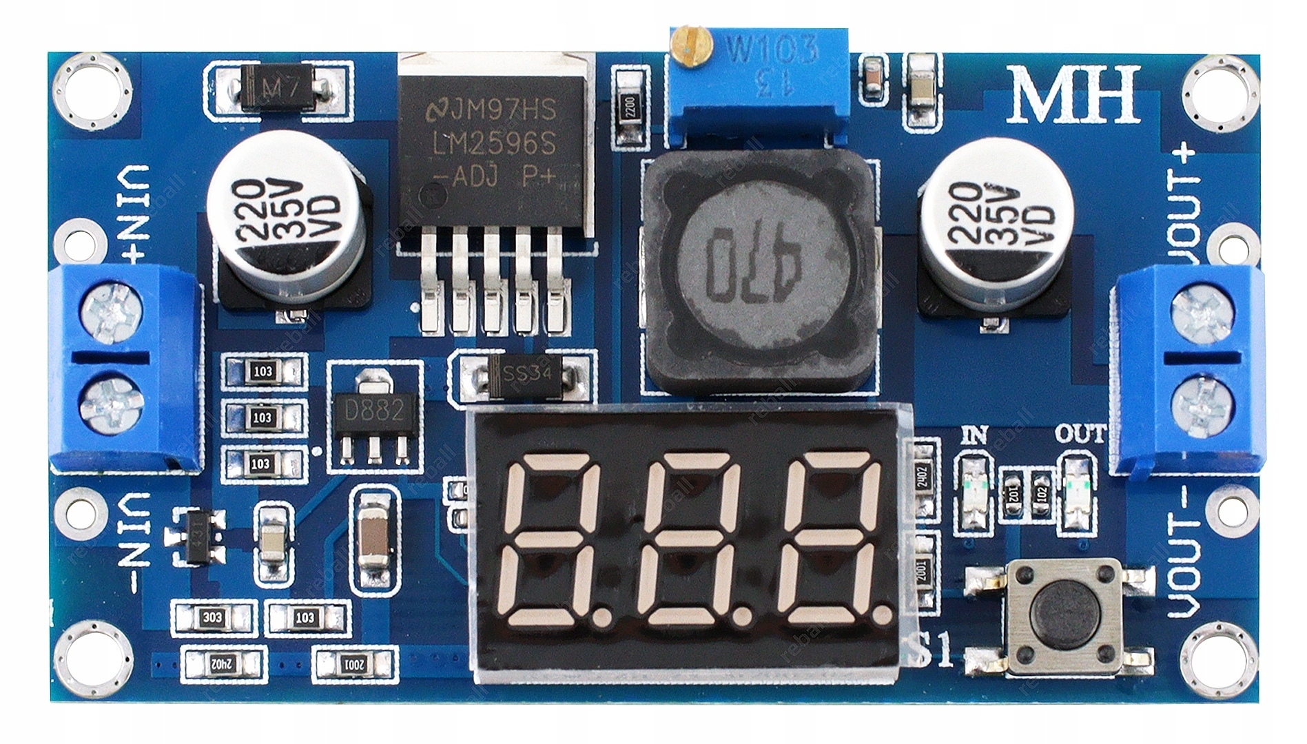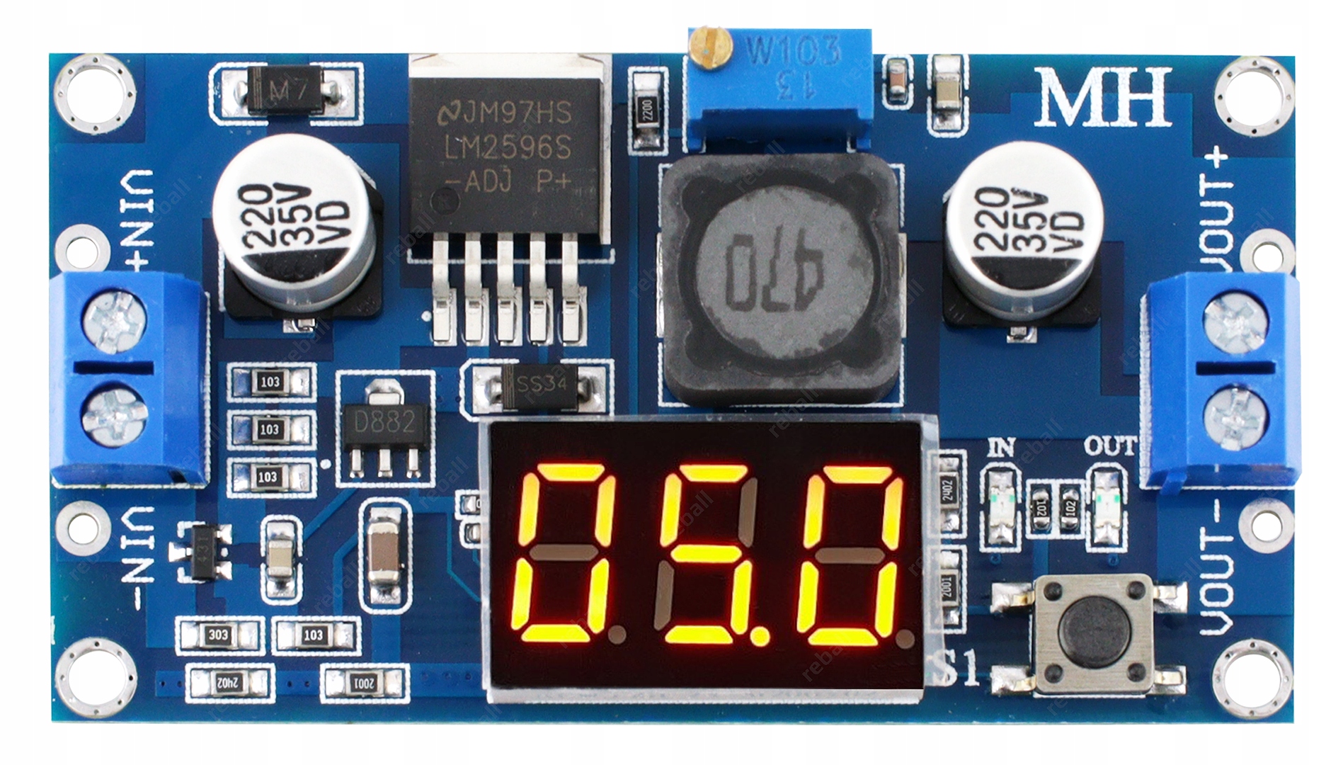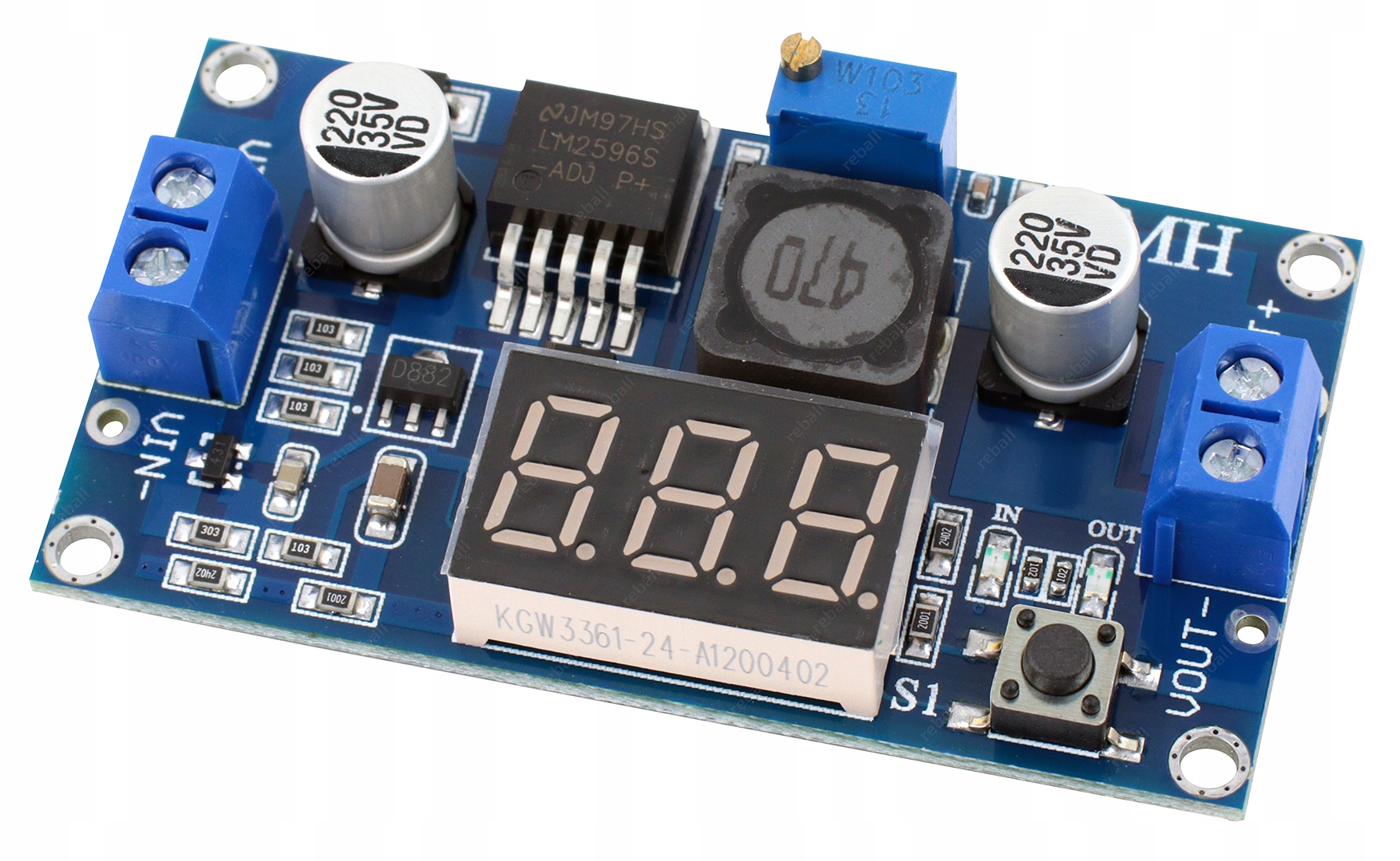 Uniwersalny moduł zasilacza - przetwornica obniżająca napięcie w granicach 2,5V-35V. Przewagą tego impulsowego stabilizatora napięcia stałego nad liniowymi jest to iż przy dużej różnicy napięcia Uwe - Uwy nie wydziela dużej ilości ciepła. Moduł pozwala osiągnąć maksymalną wydajność przy minimalnych stratach mocy. Zasilacz umożliwia precyzyjną regulację napięcia wyjściowego w dużym zakresie potencjometrem wieloobrotowym.