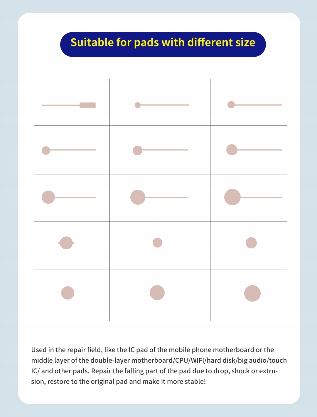 Pady można przylutować w miejscach uszkodzenia (kiedy wyprowadzenia z warstw laminatu są dostępne) jak i przykleić np. na lakier UV dostępny w naszej ofercie w różnych kolorach.