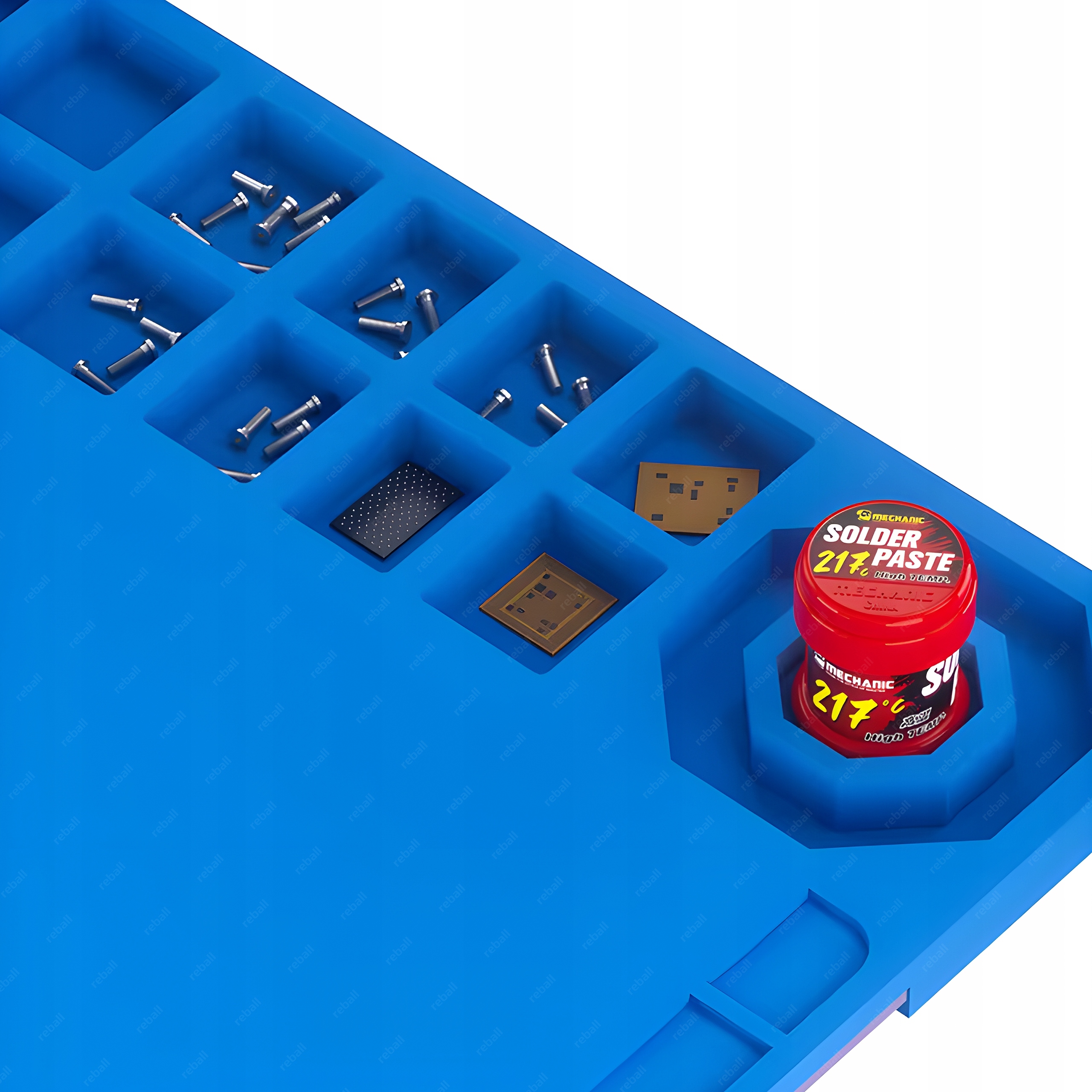✅ Wbudowane strefy organizacyjne – miejsce na śrubki, narzędzia i groty, które zapewniają porządek na stanowisku pracy.