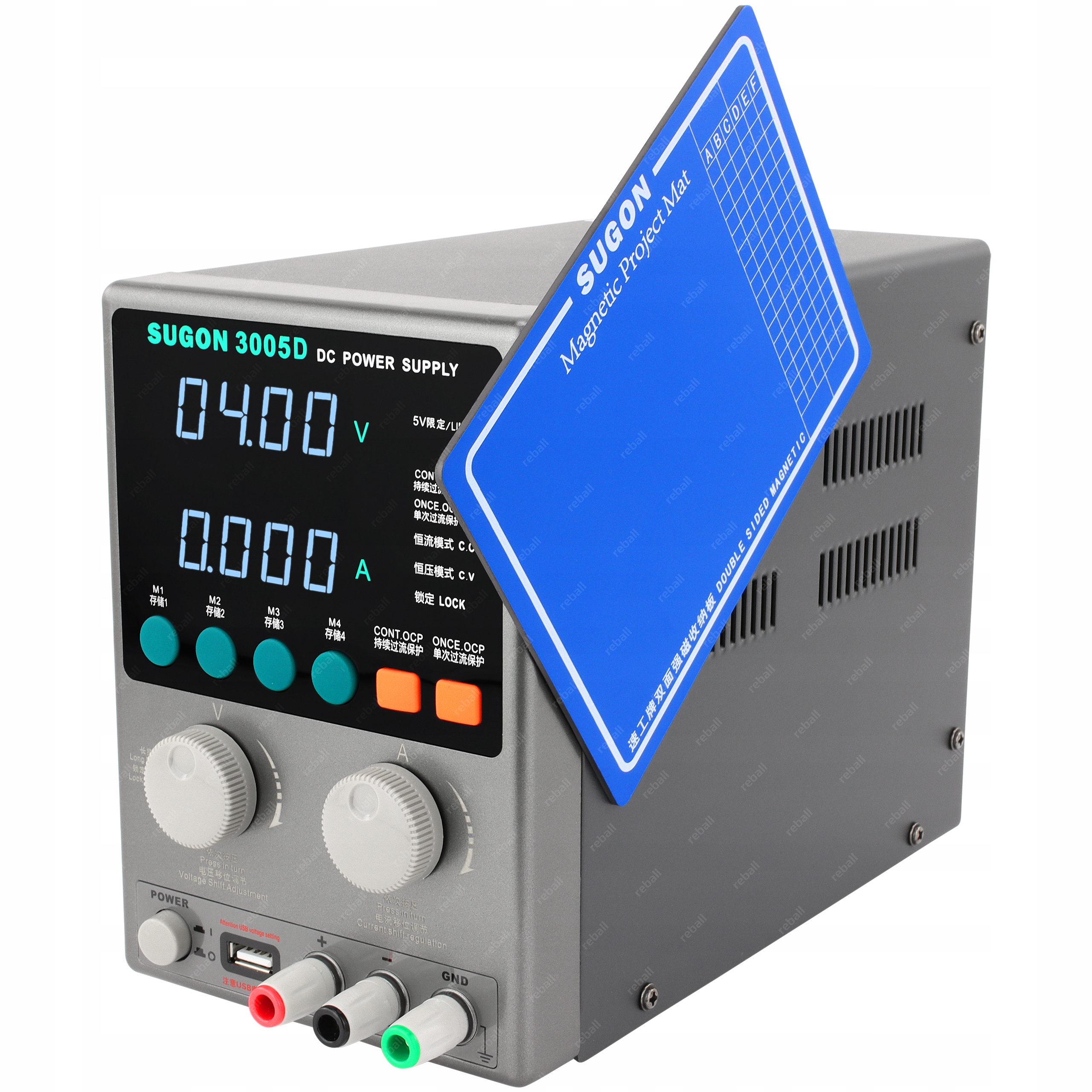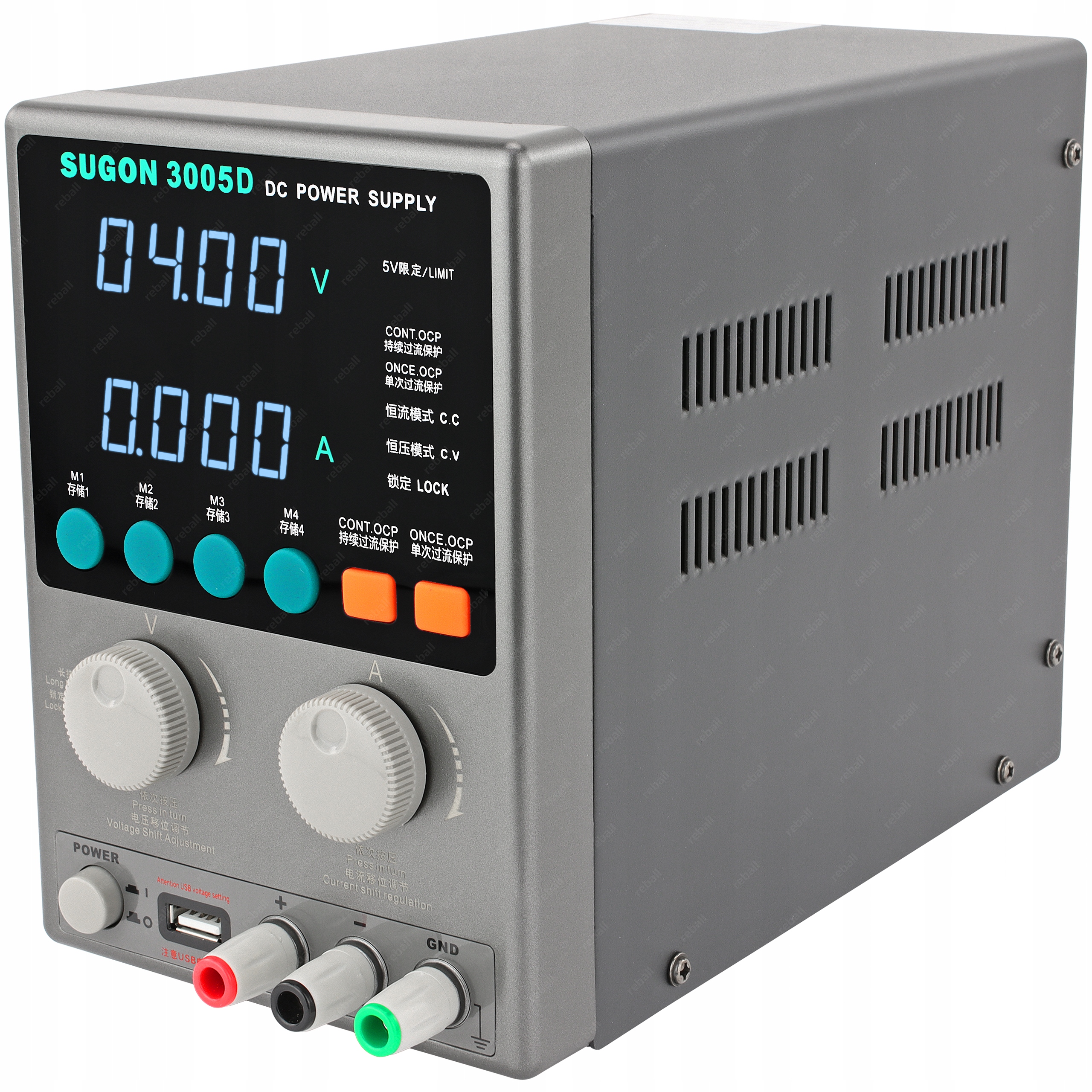 SUGON 3005D to serwisowy zasilacz laboratoryjny o maksymalnym napięciu 30V i prądzie 5A (150W), wyposażony w 4-cyfrowy wyświetlacz LED oraz zaawansowane funkcje ochrony.