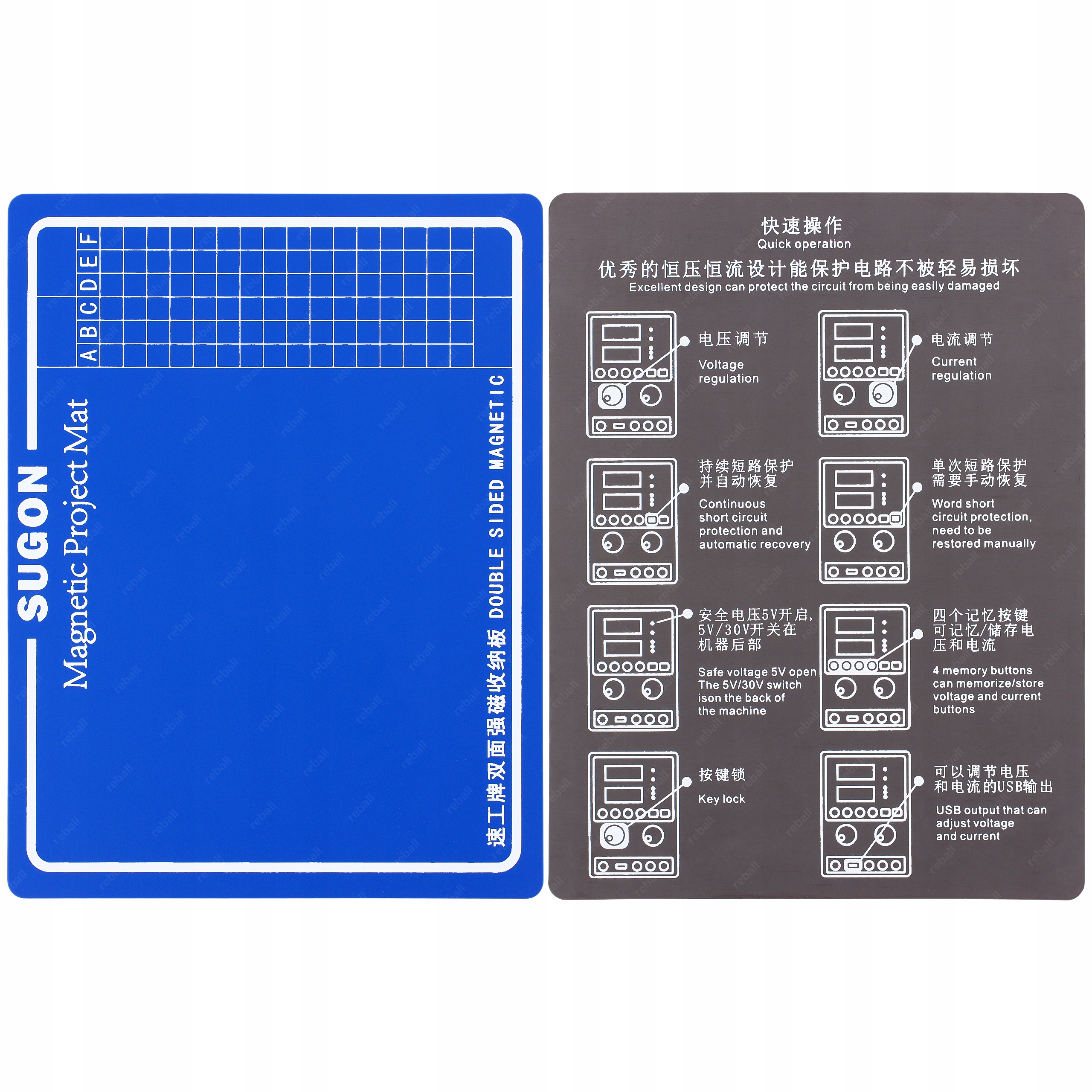 Praktyczna magnetyczna mata serwisowa dołączona do zasilacza SUGON 3005D to idealne uzupełnienie stanowiska pracy. Jedna strona maty pełni funkcję powierzchni roboczej z organizerem na śrubki i drobne elementy, wykonanym w kolorze niebieskim.