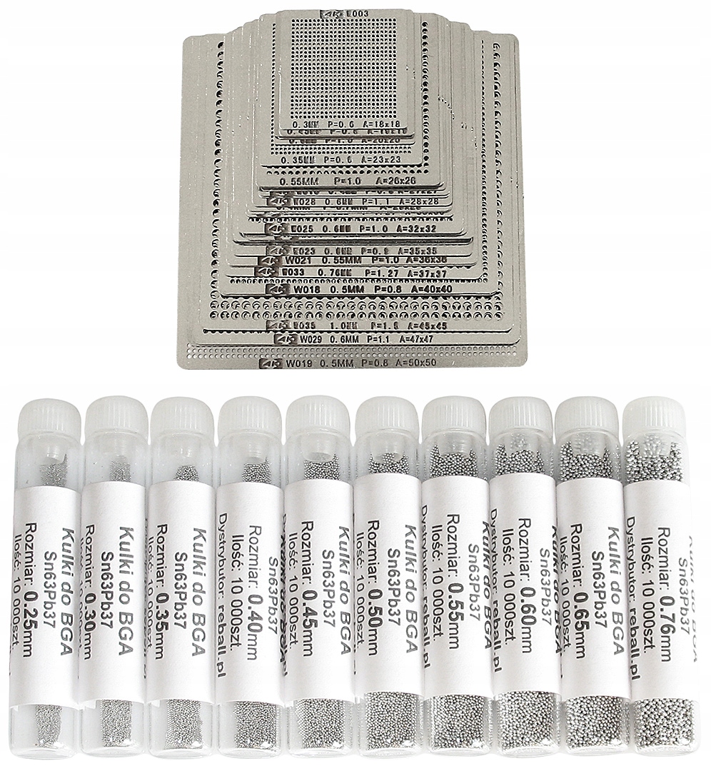 Zestaw 25 uniwersalnych sit pozwala zregenerować połączenia z podłożem dla szerokiej gamy popularnych układów BGA o równomiernym rastrze co szczególnie ważne jest dla serwisów RTV gdzie do występujących w tym obszarze układów BGA wybór dedykowanych sit jest bardzo ubogi.