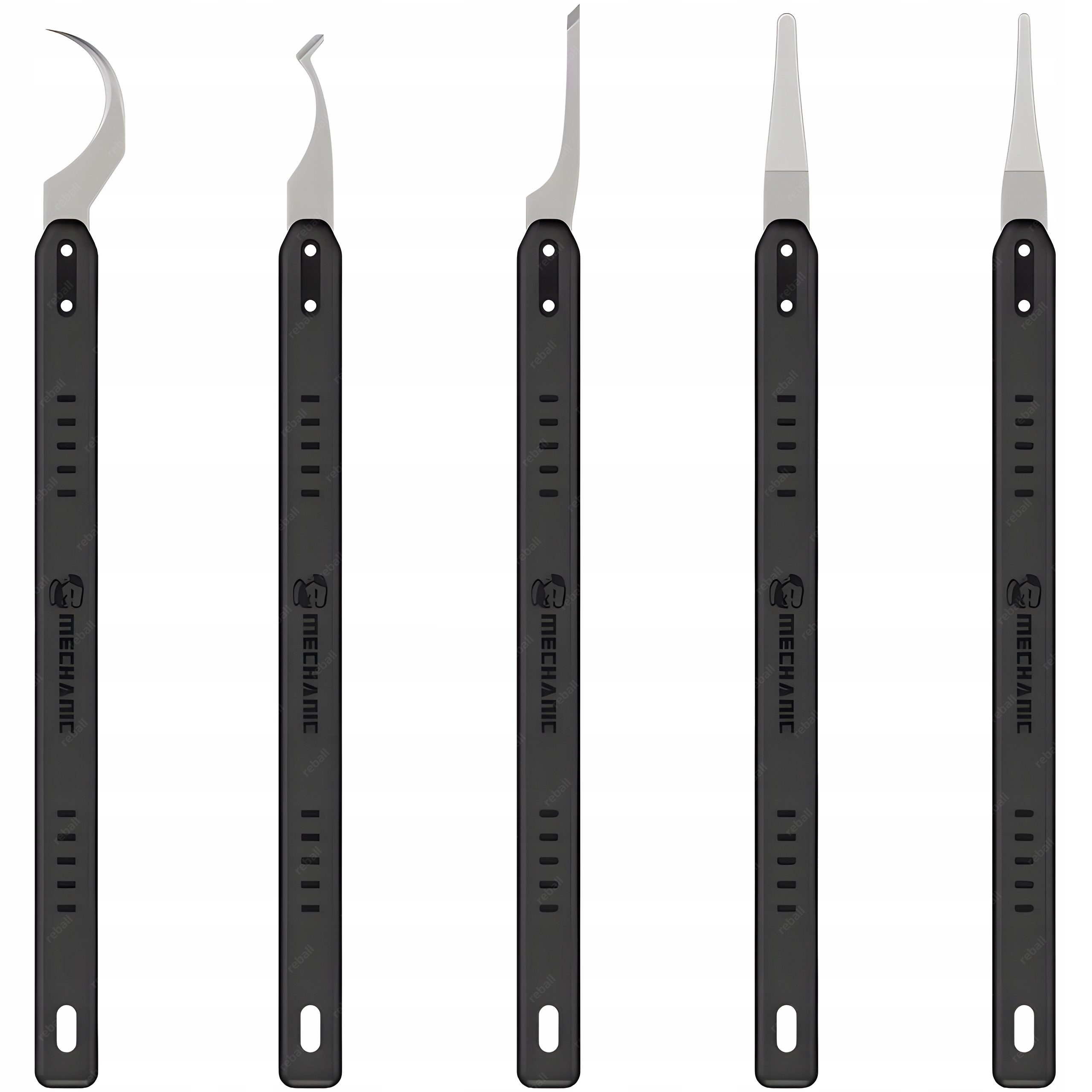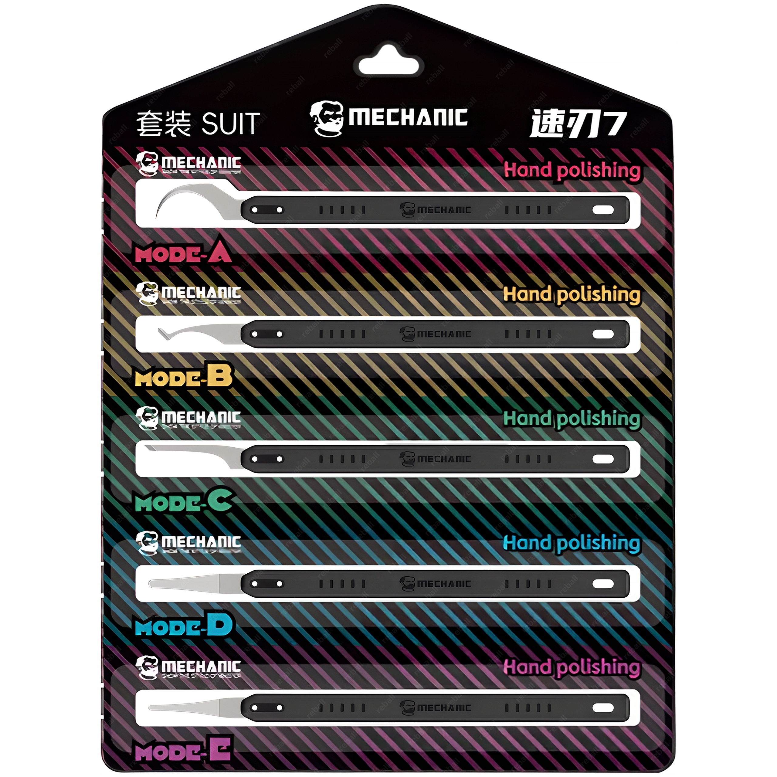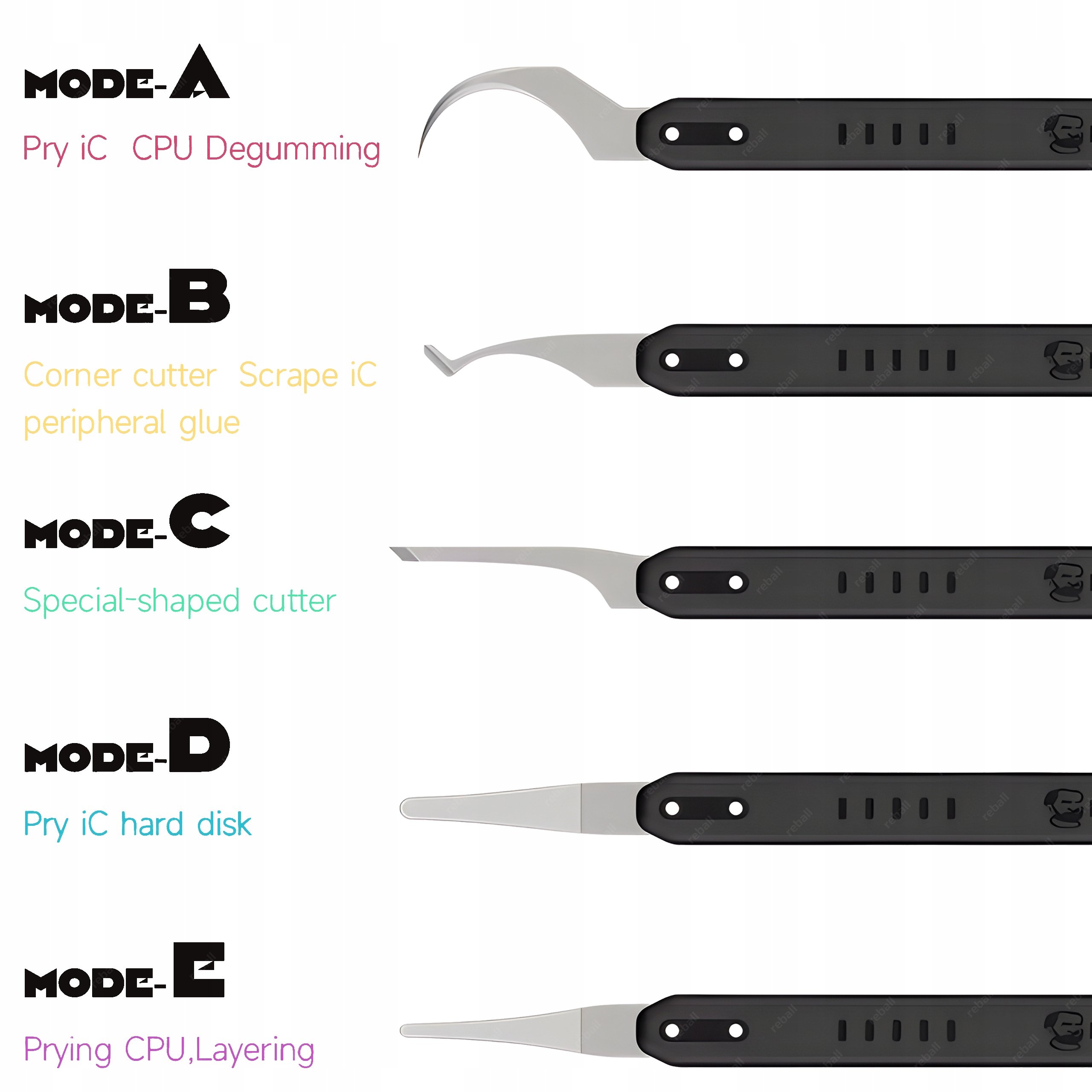 Zestaw 5 precyzyjnych skalpeli przeznaczonych do separacji i podnoszenia układów BGA, SMD, CPU, GPU, MPU z PCB, cięcia kleju, usuwania kleju bądź nakładania pasty lutowniczej za pomocą szerokich końcówek na układy BGA przez szablony BGA Plate.