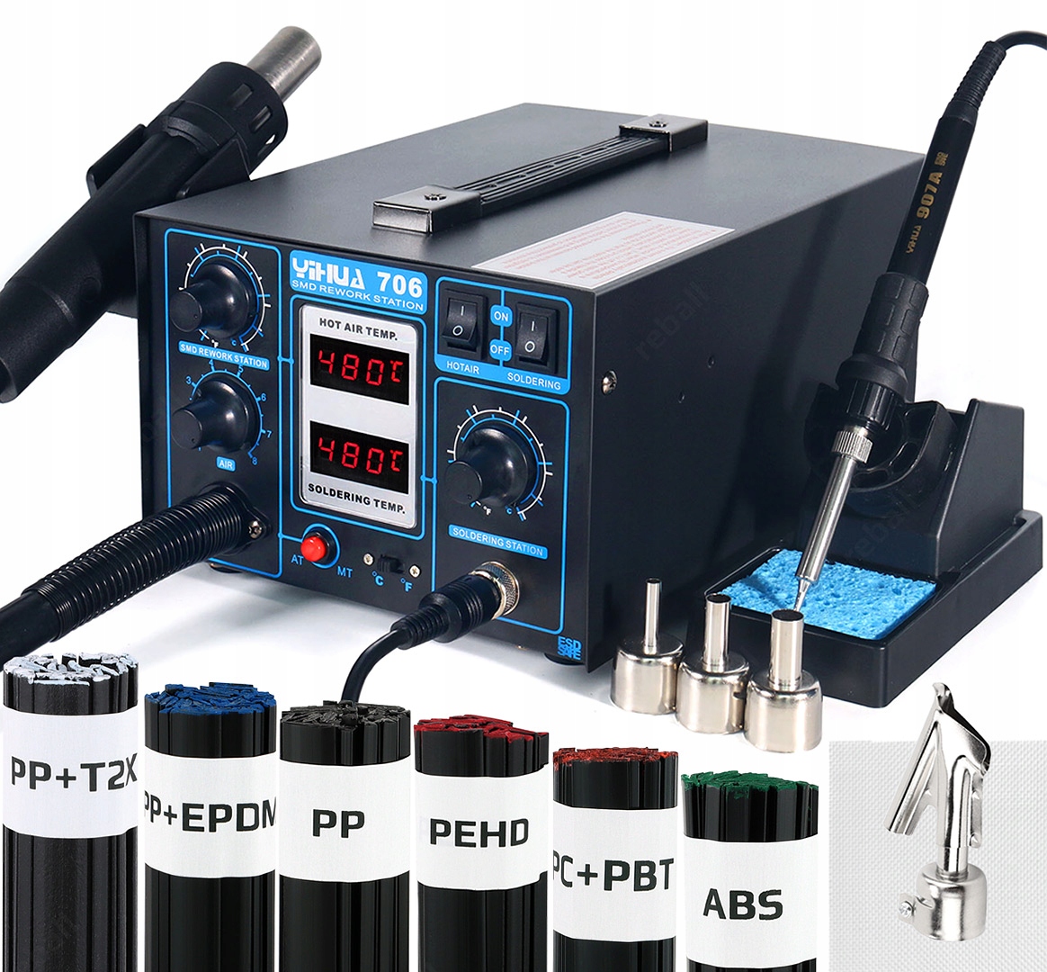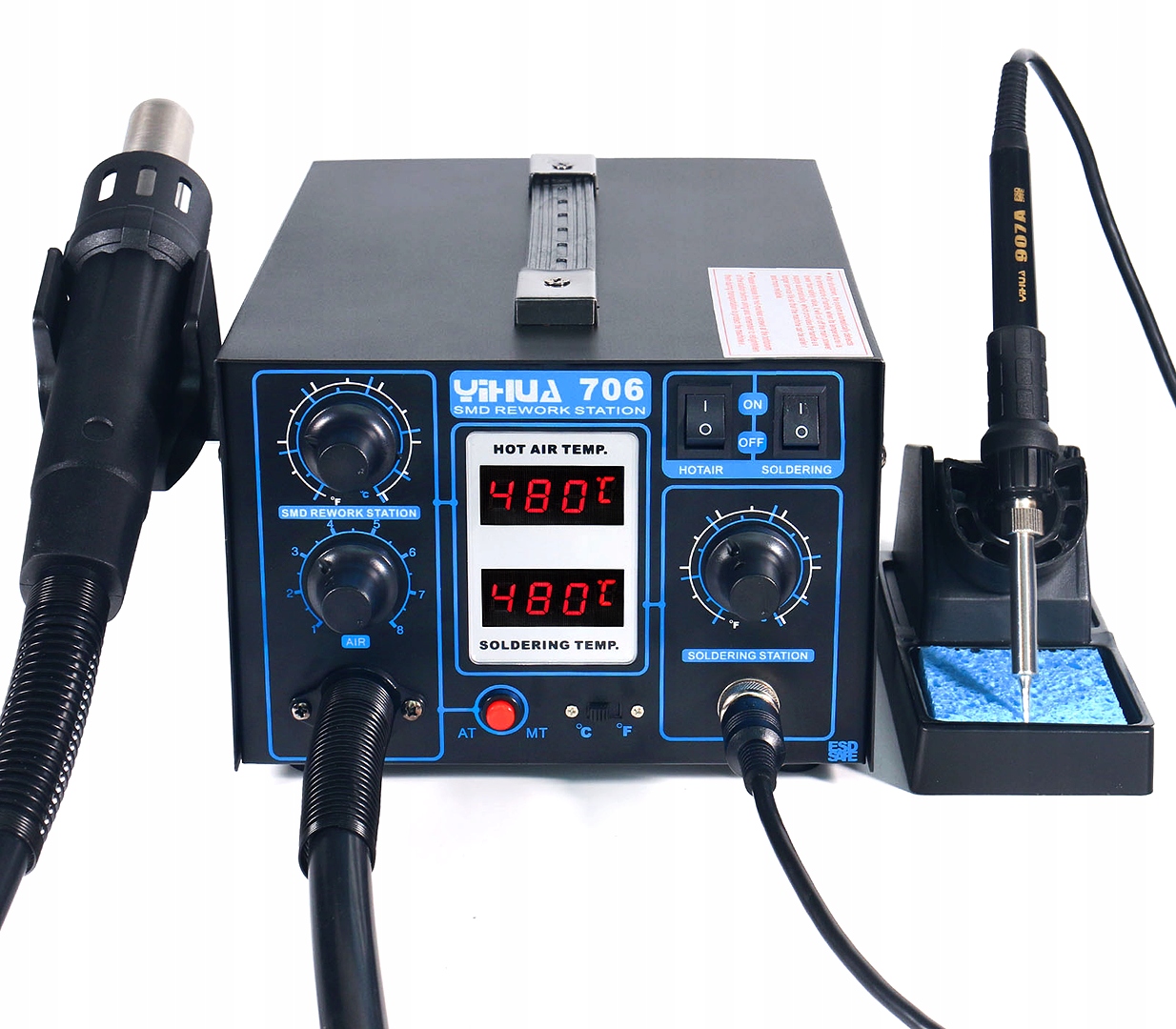 Stacja lutownicza Yihua 706 2w1 z regulacją temperatury w zakresie od 200°C do 480° posiada dwie wbudowane lutownice: