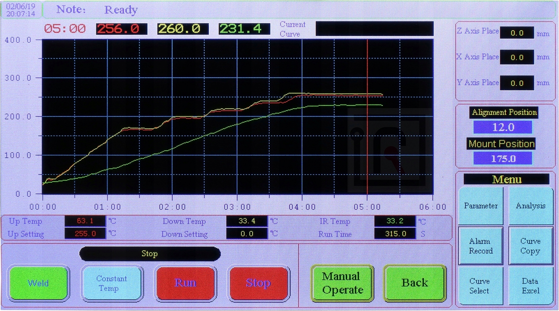 Po skończonym procesie lutowniczym na wyświetlaczu można przeanalizować pełen przebiegu procesu grzania w każdej 3 stref grzewczych i każdego z 7 czujników (3 wbudowane + 4 zewnętrzne). Można również eksportować te parametry poprzez port USB do pliku csv lub bmp.