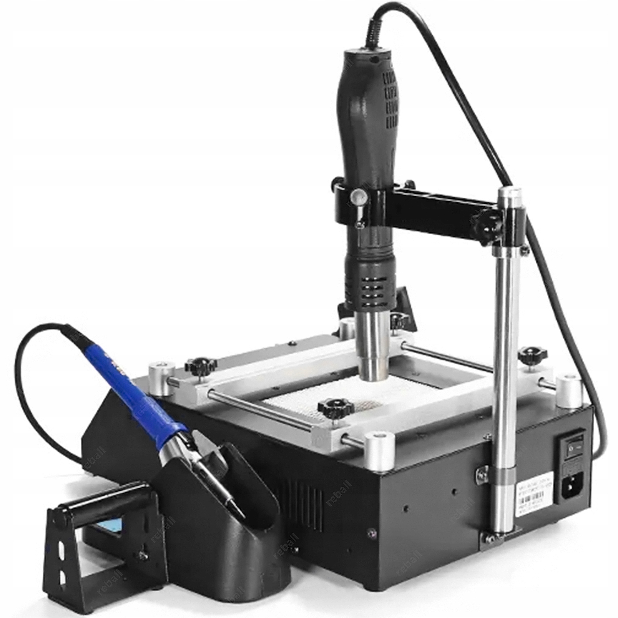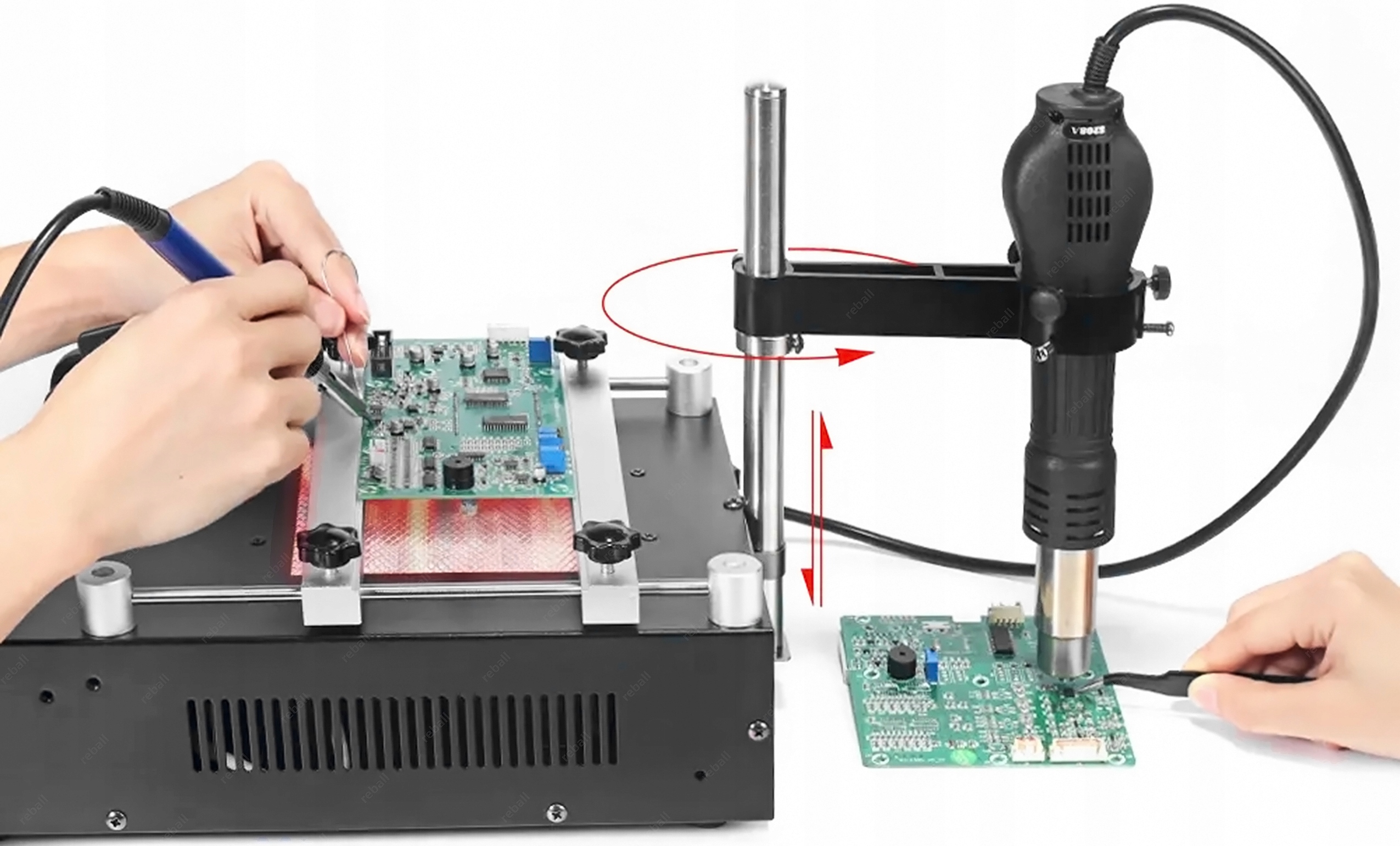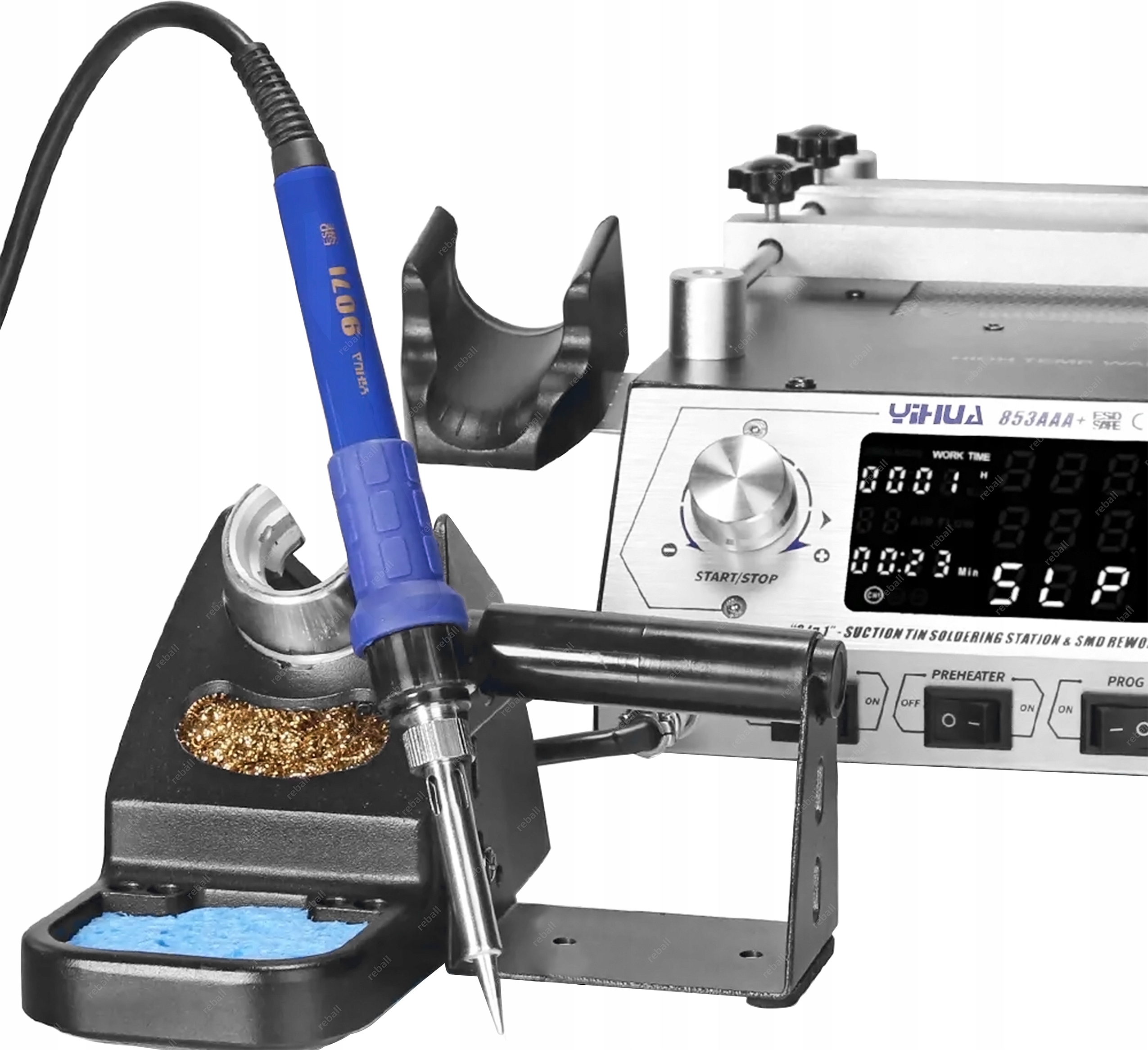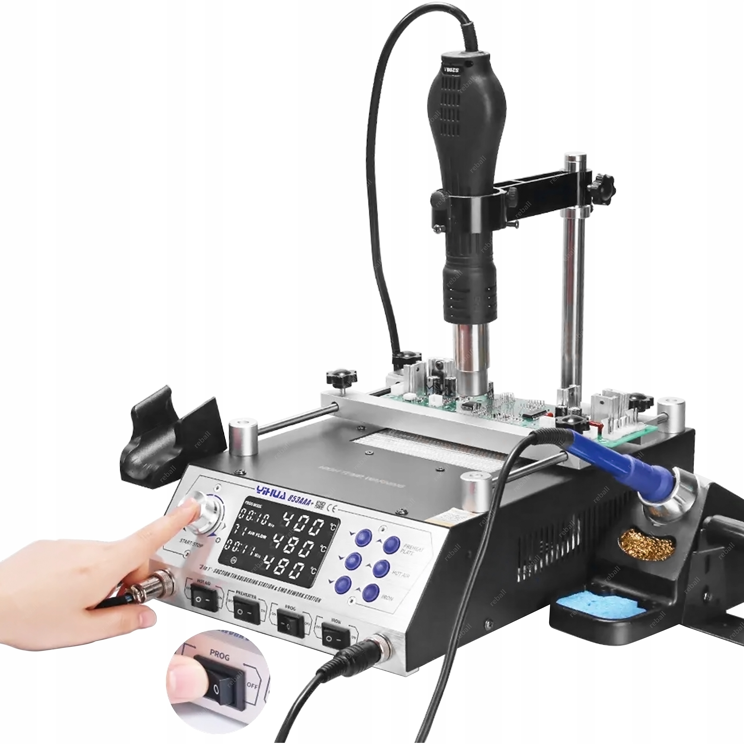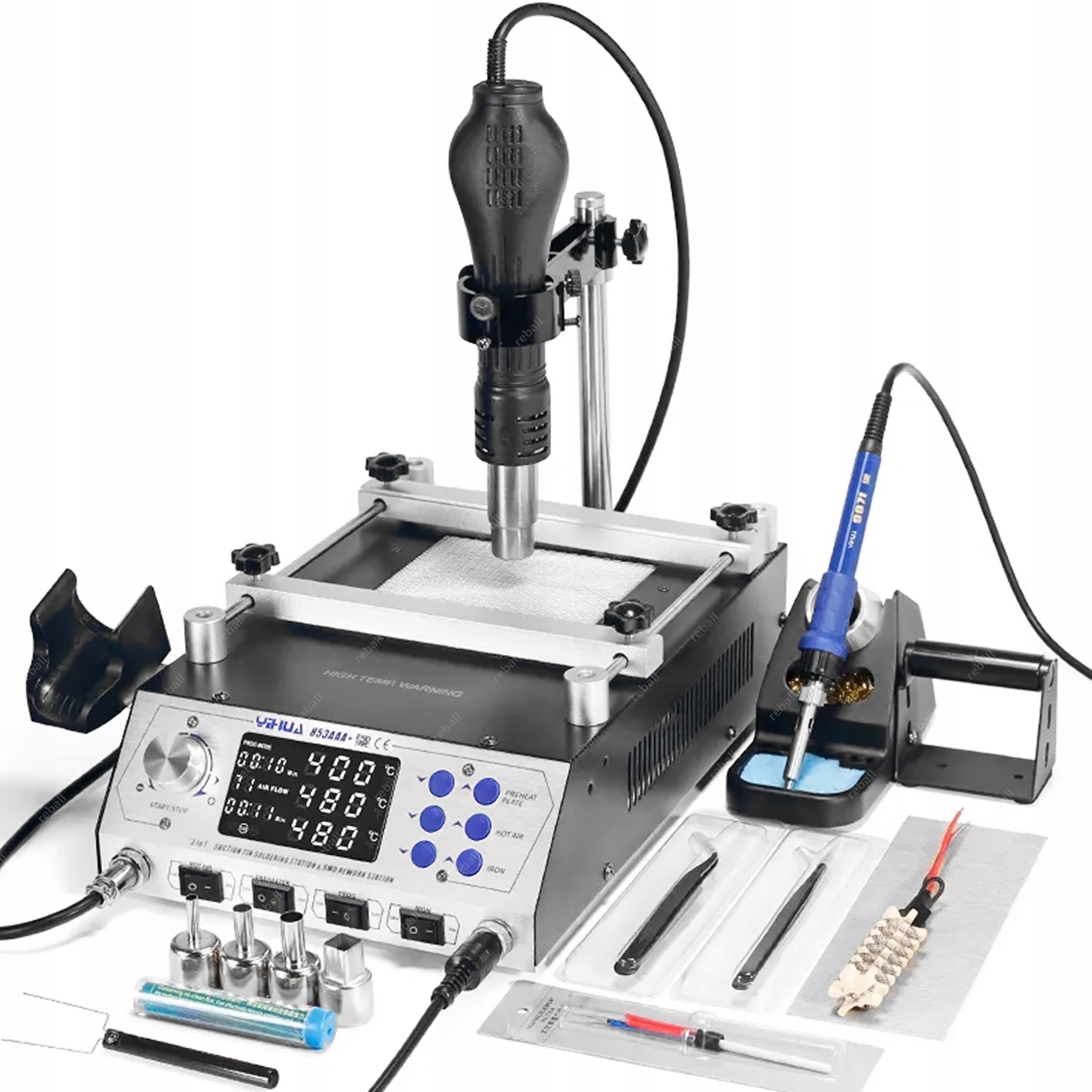 YIHUA 853AAA+ wypełnia lukę w urządzeniach do demontażu z niewielkich płyt takich jak np. telefony, nawigacje układów BGA, QFP, PLCC czy innych drobnych elementów SMD. Dzięki połączeniu podgrzewacza z lutownicą hotair na statywie oraz lutownicą kolbową praca ta jest wygodna i bezpieczna gdyż serwisant ma obie ręce wolne podczas montażu i bezpieczna.