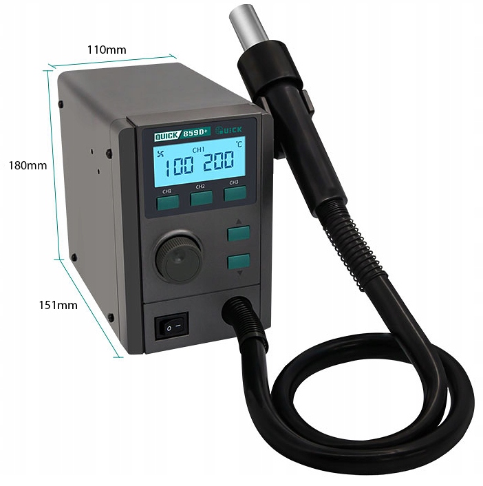 Quick 859D+ to stacja lutownicza na gorące powietrze (hotair). Urządzenie przeznaczone jest do lutowania i wylutowywania elementów w elektronice. Sprawdzi się zarówno dla hobbistów, jak i profesjonalnych warsztatów.