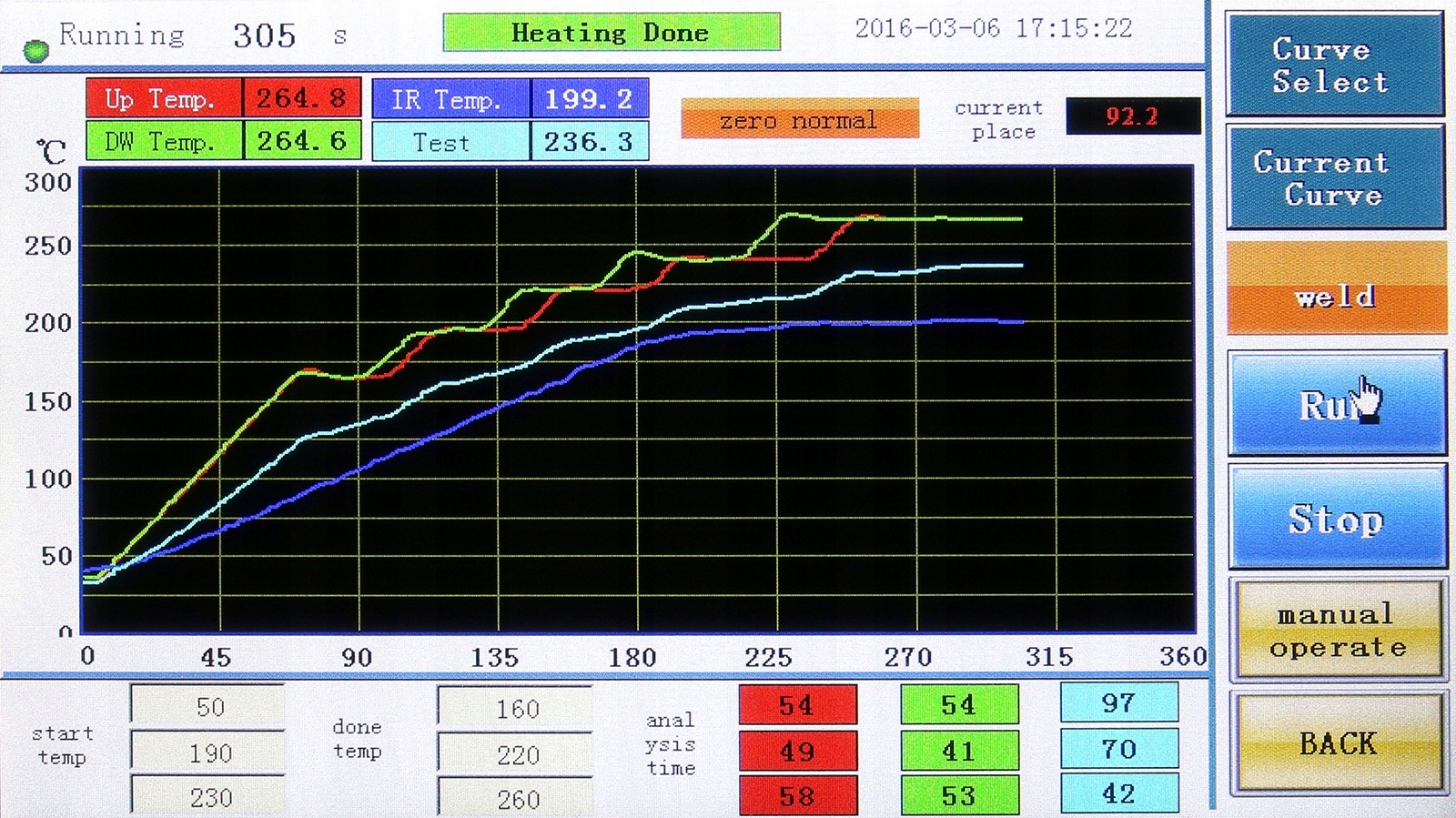 Po skończonym procesie lutowniczym na wyświetlaczu można przeanalizować pełen przebiegu procesu grzania w każdej z 3 stref grzewczych.