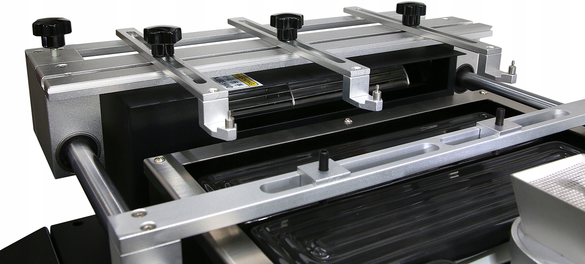 Stacja wyposażona jest w 5 punktów podparcia płyty po każdej ze stron. Główny uchwyt płyt PCB został wyposażony w żłobienie typu V co zapewnia szybki i stabilny montaż płyt oraz duży zakres regulacji.