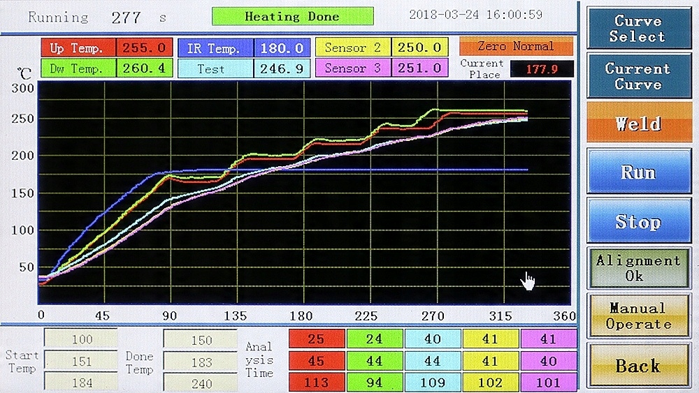 Po skończonym procesie lutowniczym na wyświetlaczu można przeanalizować pełen przebiegu procesu grzania w każdej 3 stref grzewczych i każdego z 6 czujników.