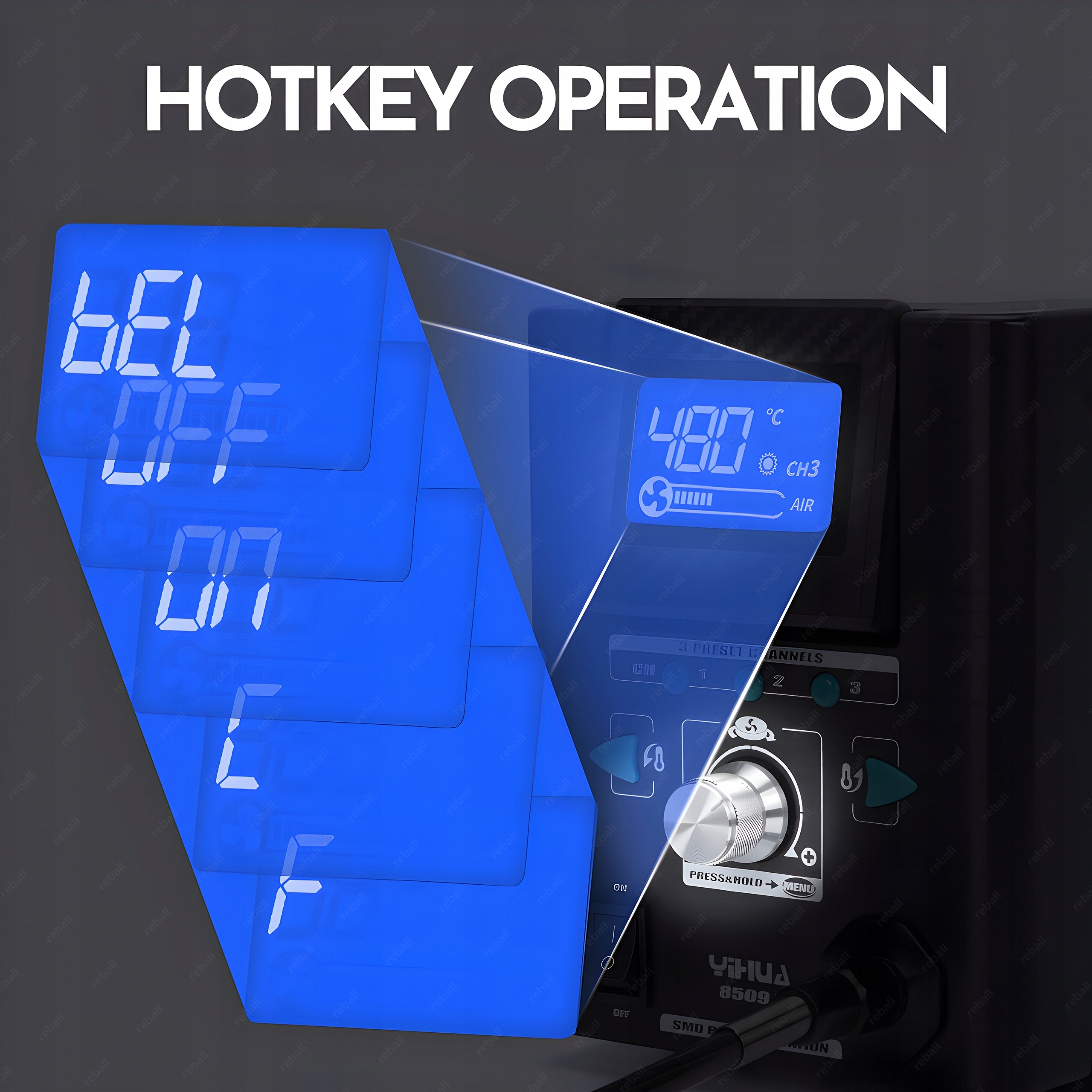 ✅ krótkie naciśniecie przycisku powoduje przełączenie kolby z funkcji grzania na schładzanie. Kolba zaczyna dmuchać zimnym powietrzem, a na wyświetlaczu pojawia się napis COL. Jest to bardzo przydatne rozwiązanie gdy nie chcemy uszkodzić laminatu gorącym powietrzem.