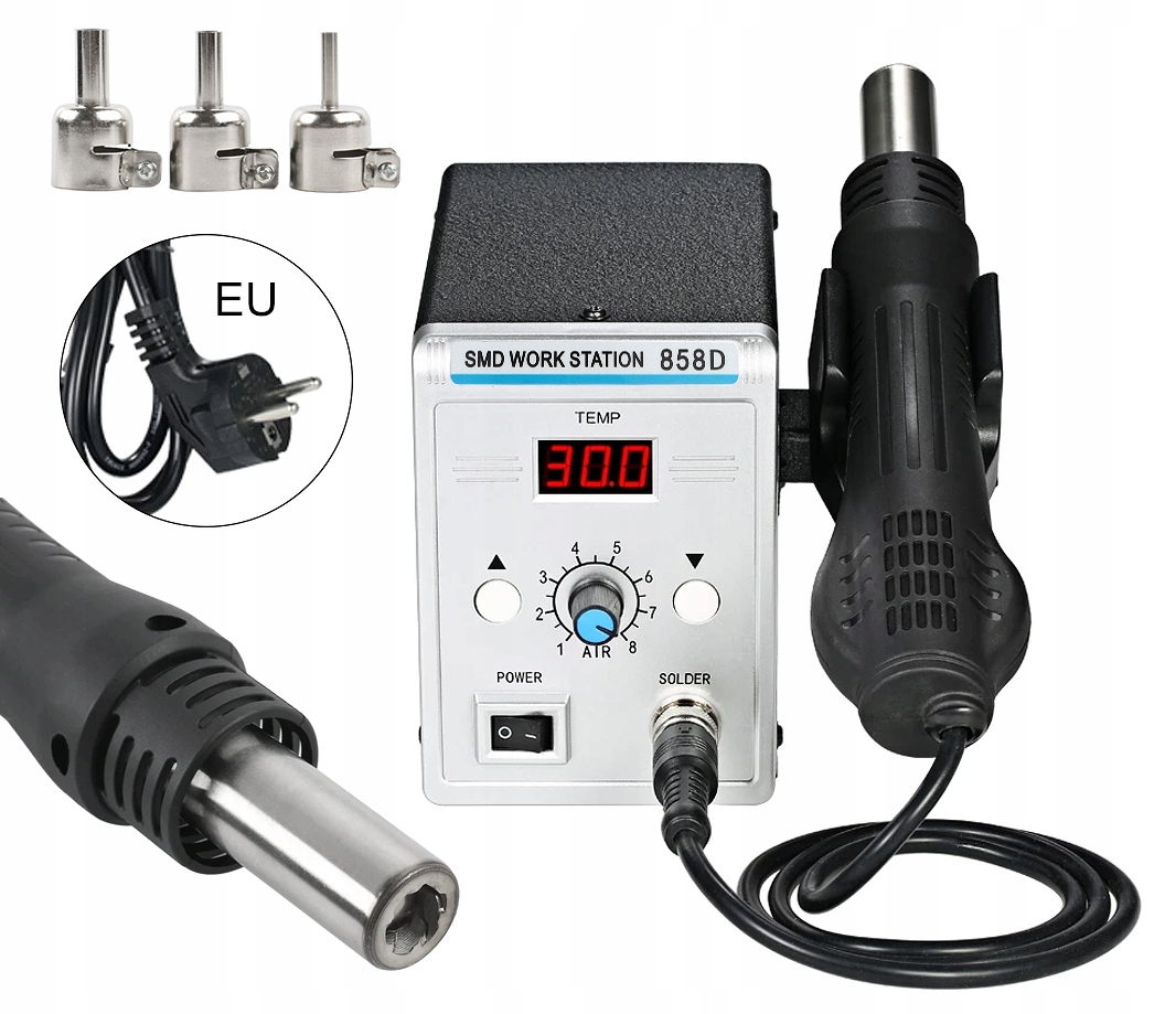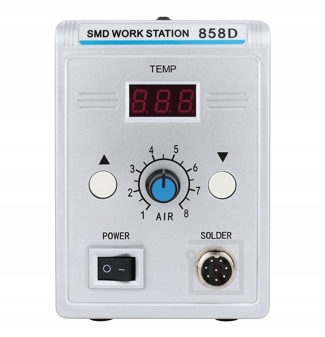 Stacja lutownicza na gorące powietrze 858D o mocy 700W to kompaktowa stacja hotair uniwersalnego przeznaczenia. Stacja może służyć zarówno do prac lutowniczych w zakresie elektroniki jak i np. do spawania plastików. Ten model stacji jest bardzo uniwersalny zarówno dla hobbystów jak i użytkowników zaawansowanych.