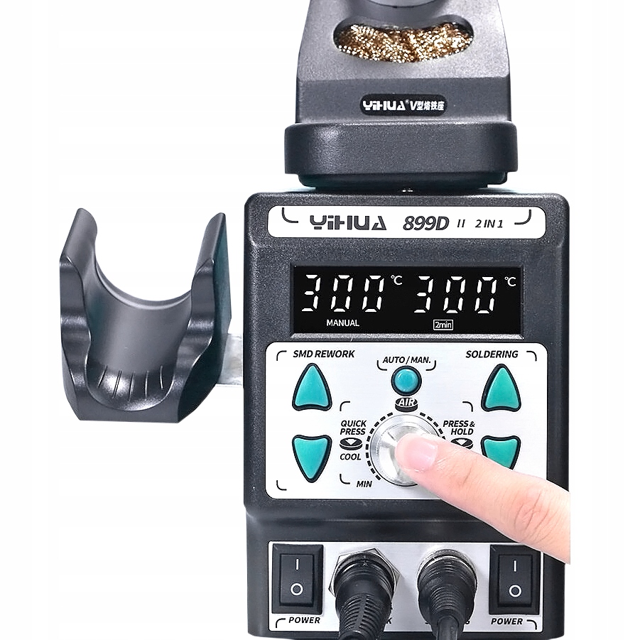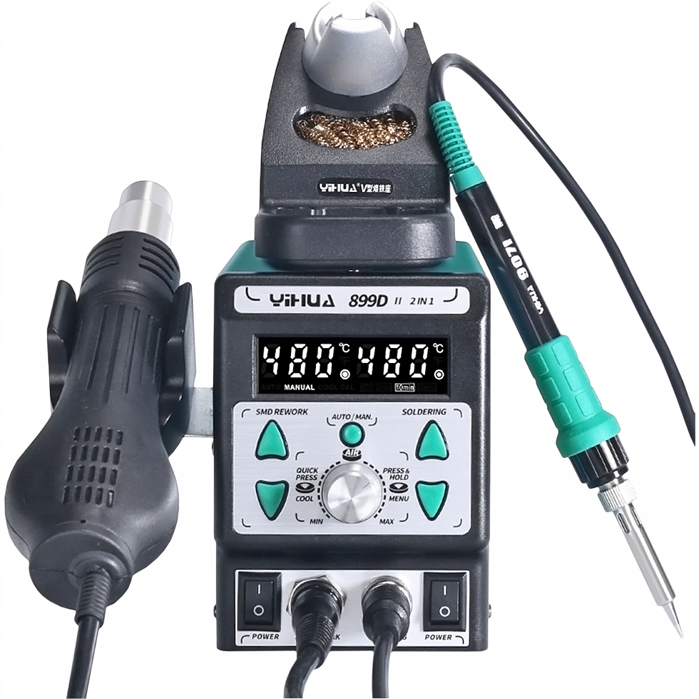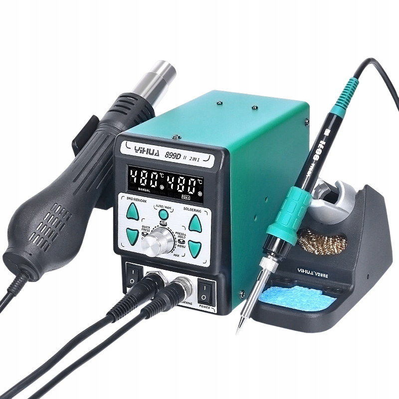 W jednym czasie można korzystać z lutownicy hotair jak i lutownicy grotowej. Stacja posiada dwa wyświetlacze które wskazują temperaturę każdej z lutownic niezależnie.