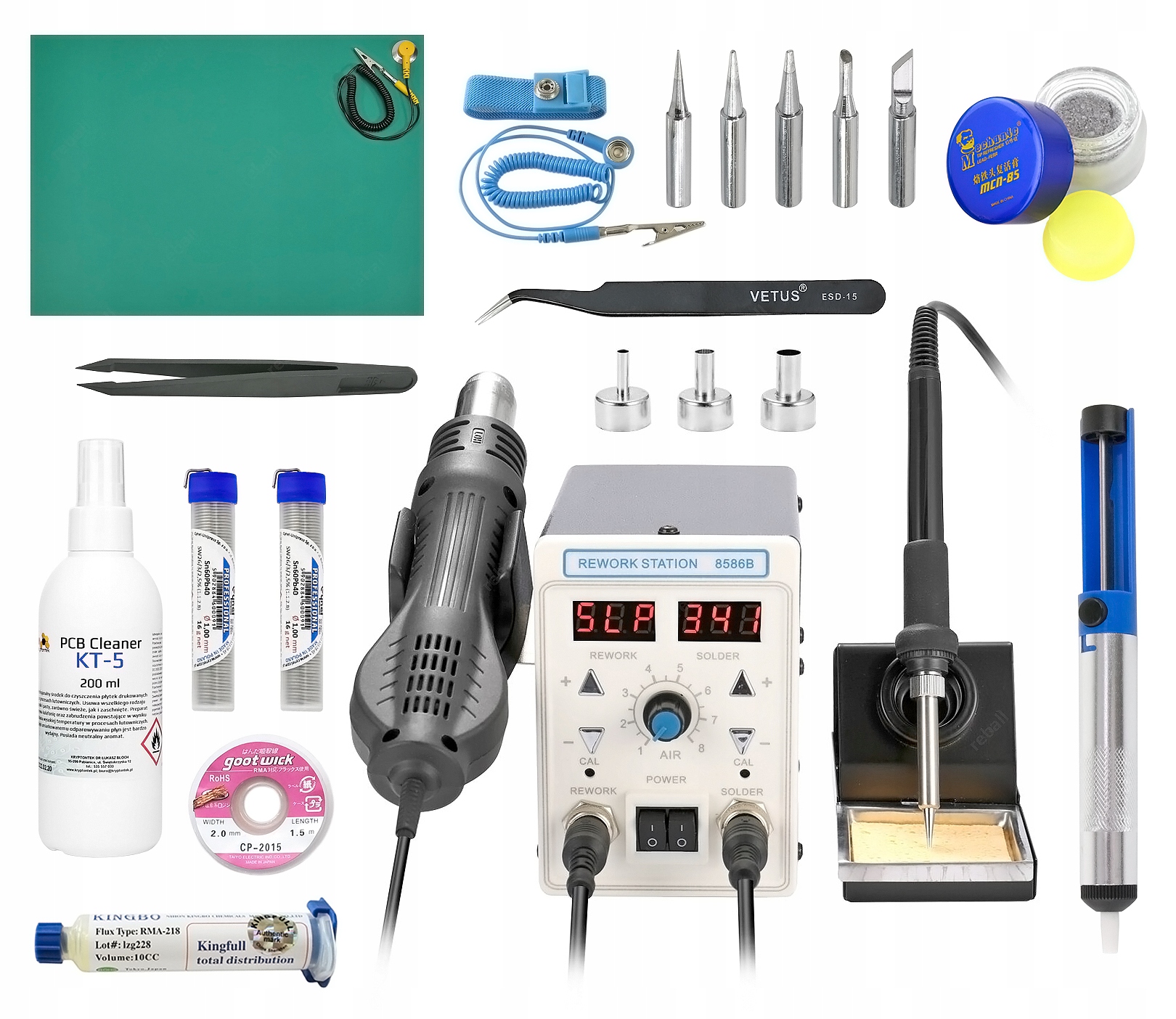 Stacja lutownicza 8586B o mocy 760W posiada dwie wbudowane lutownice: