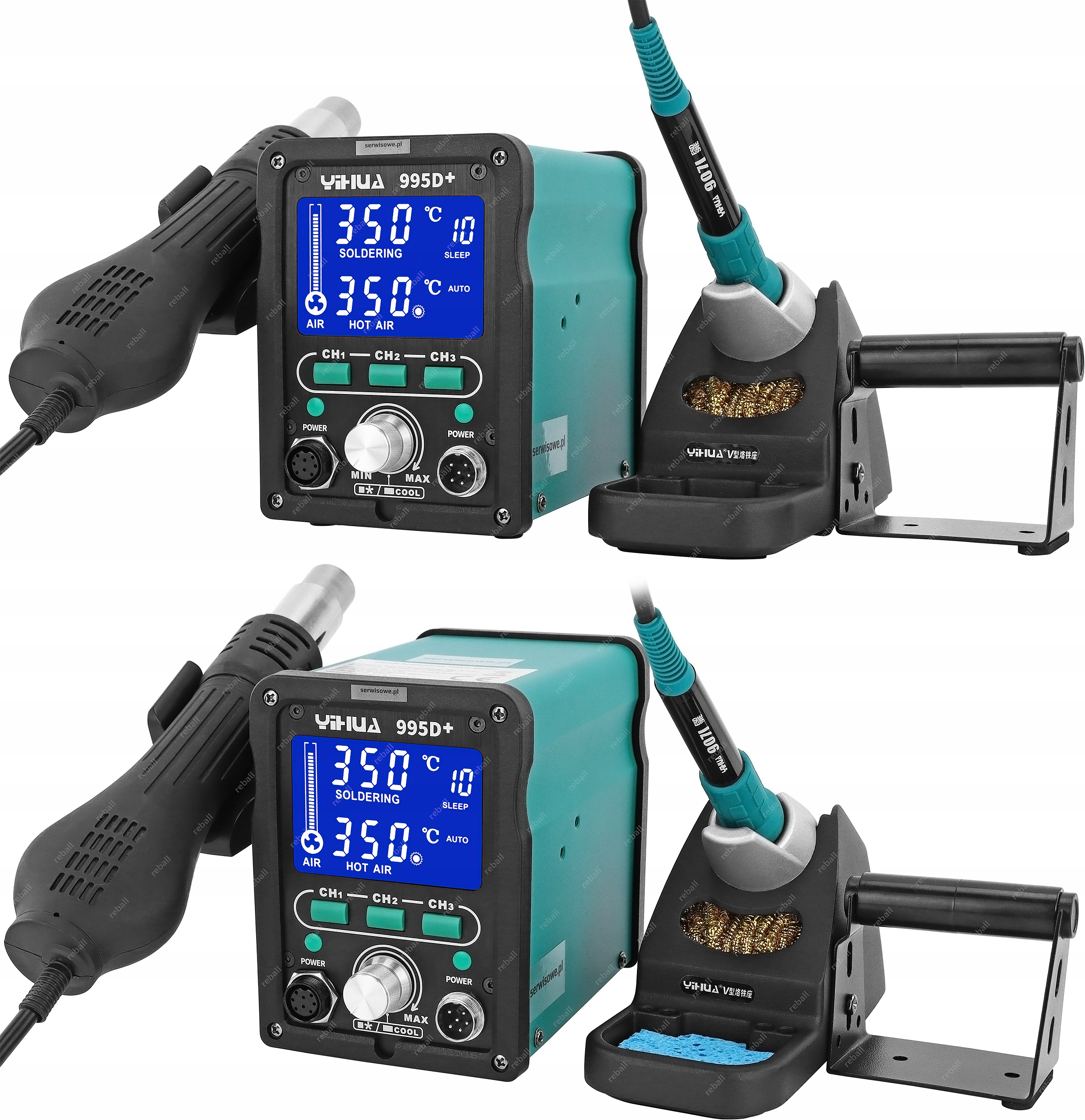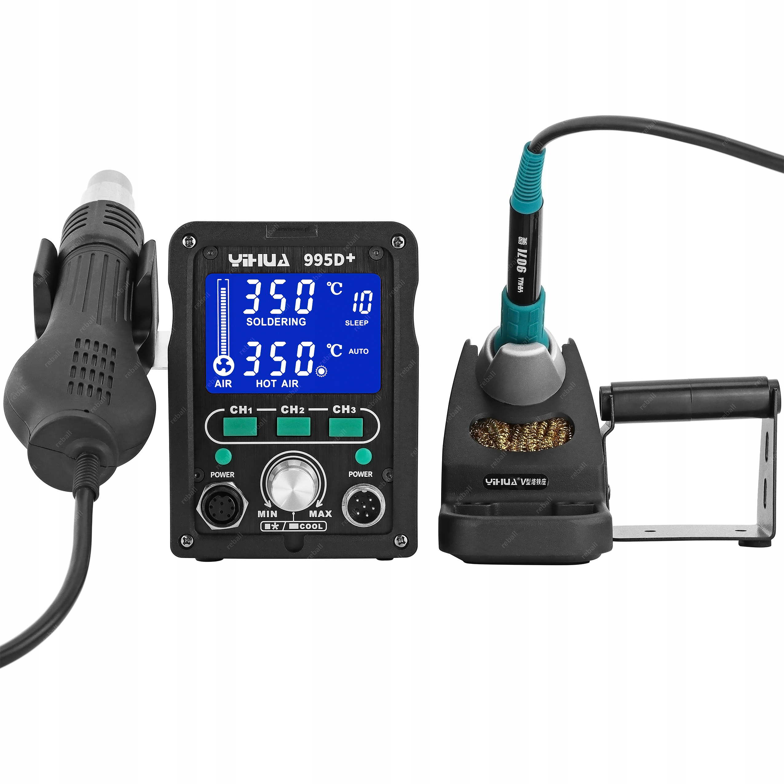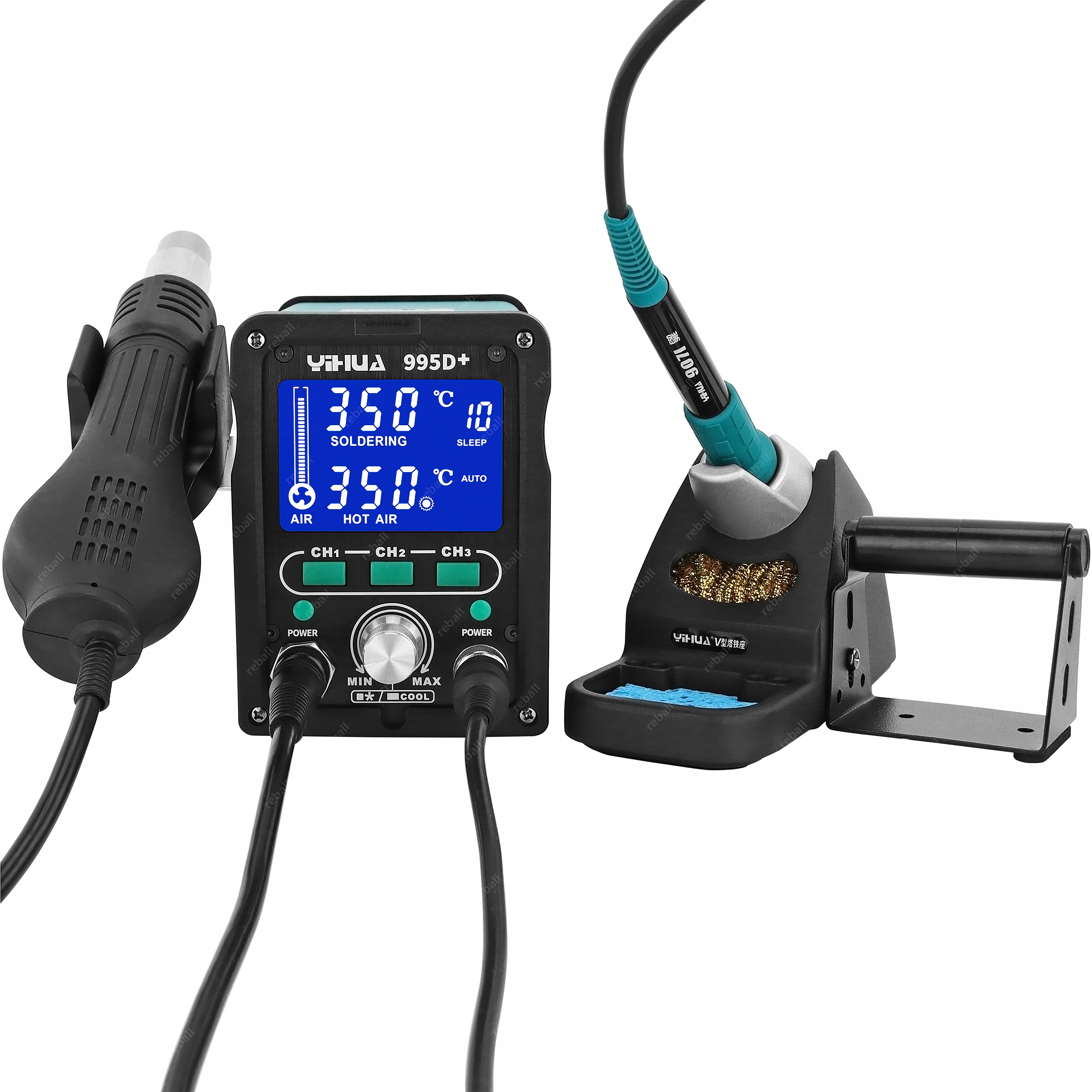 Stacja lutownicza 2w1 YIHUA 995D+ o mocy 750W wyposażona jest w hot air (gorące powietrze) oraz kolbę lutowniczą.