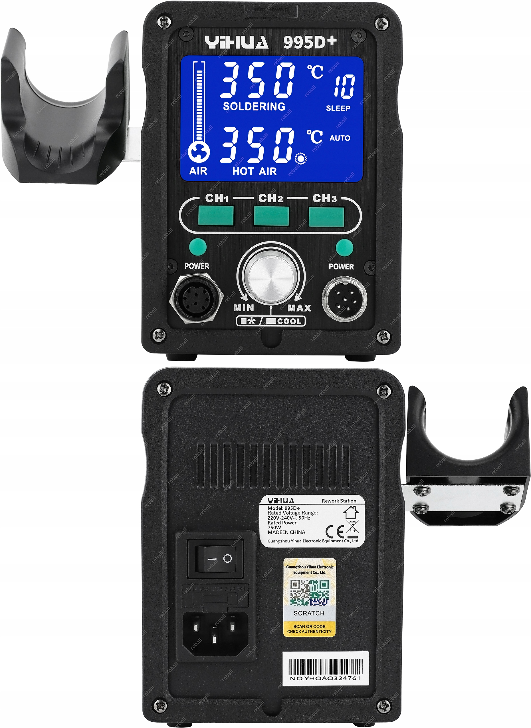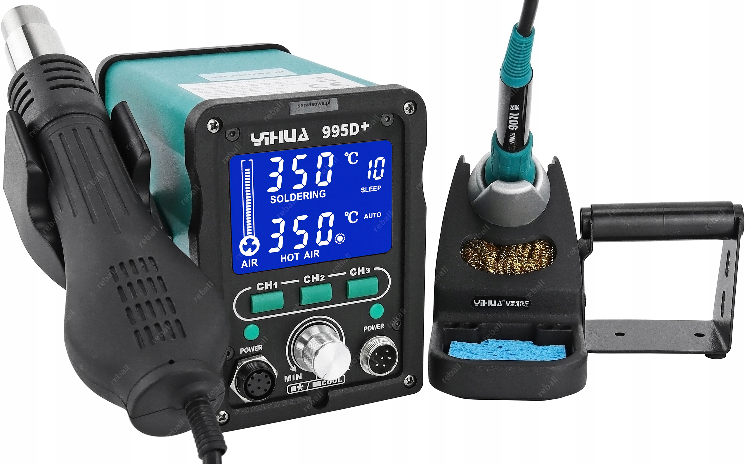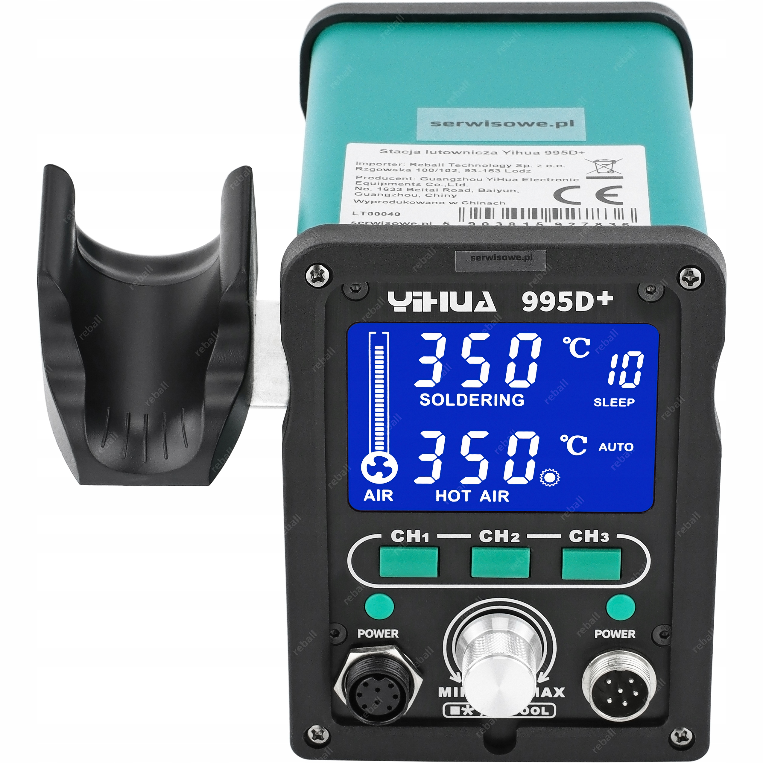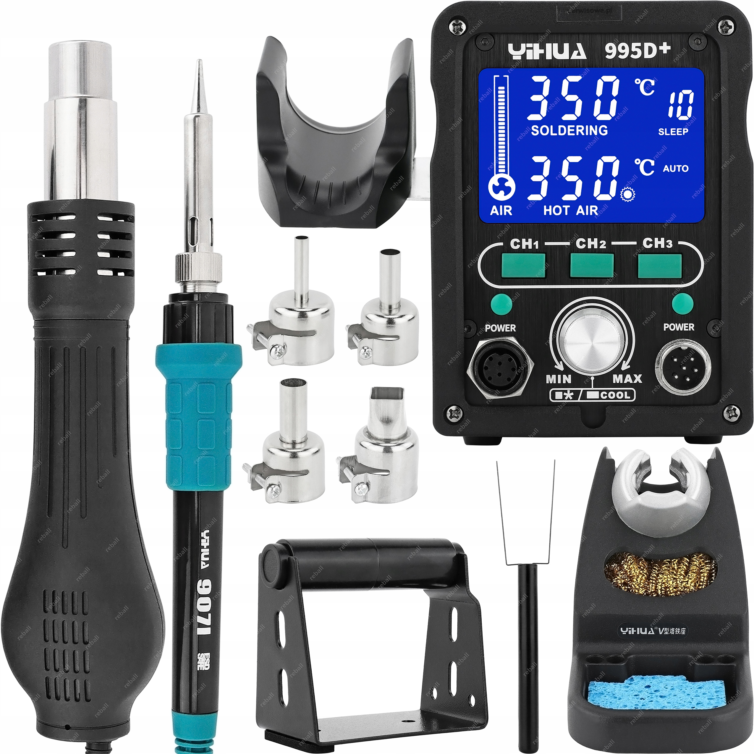 Stacja lutownicza 2w1 YIHUA 995D+ o mocy 750W wyposażona jest w hot air (gorące powietrze) oraz kolbę lutowniczą.