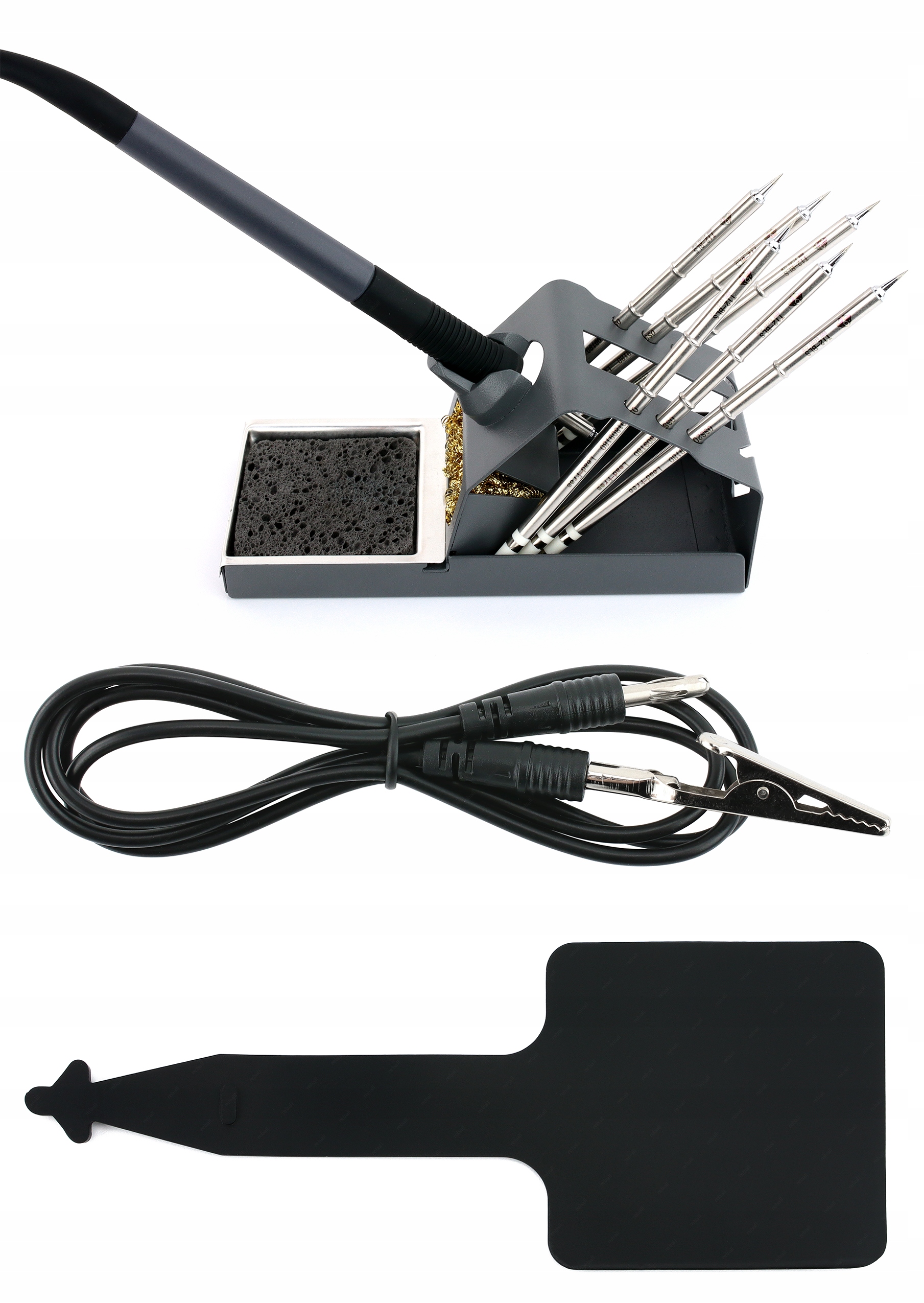 W zestawie znajdują się również miedziany czyścik i gąbka do czyszczenia grotów oraz praktyczna podstawka do kolby która umożliwia przechowywanie 6 zapasowych grotów T12. W skład zestawu wchodzi tylko jeden grot T12-BLS.