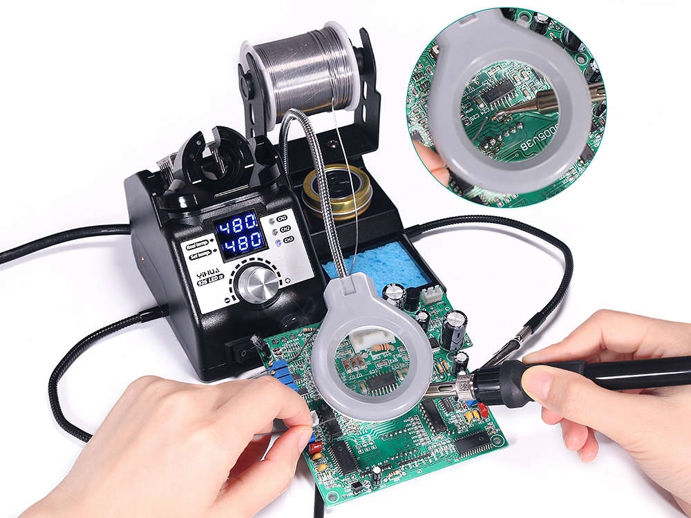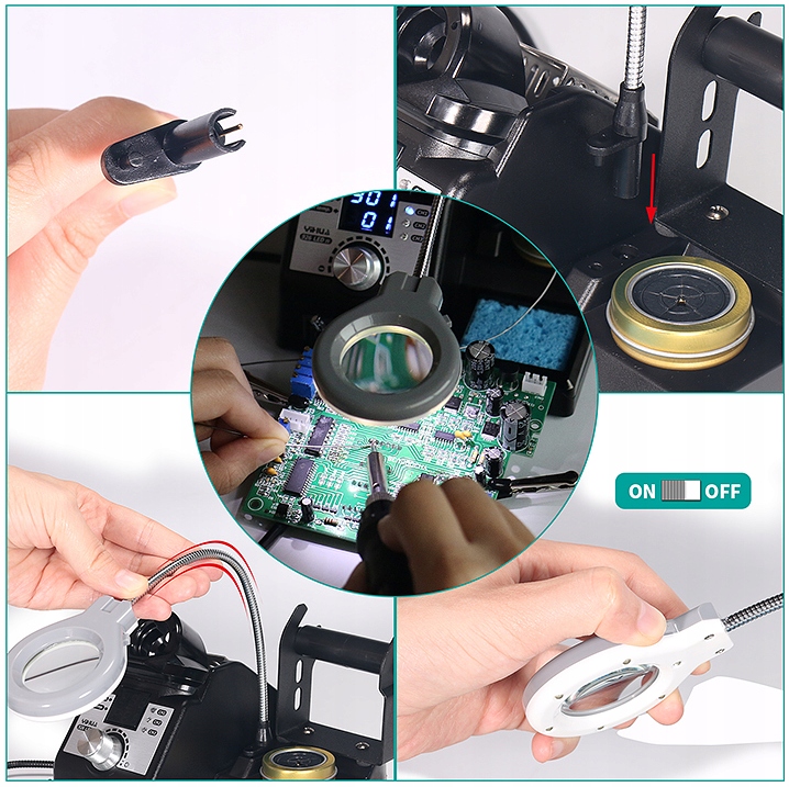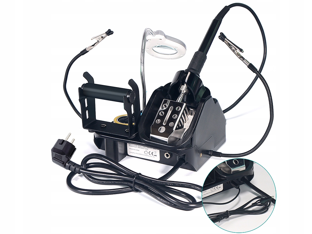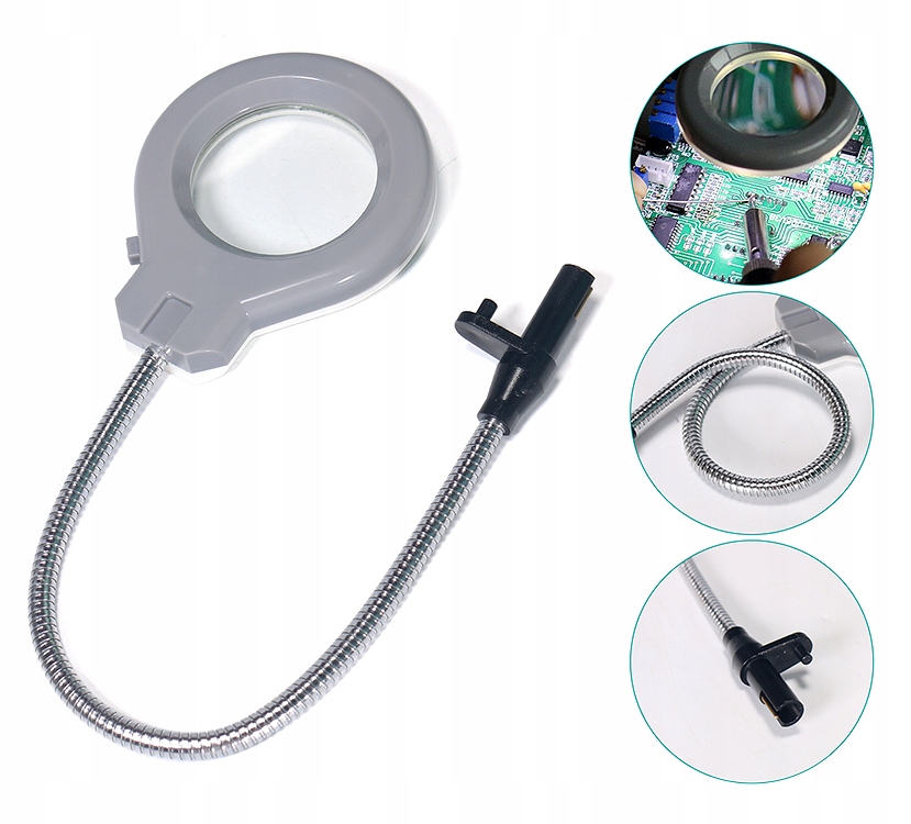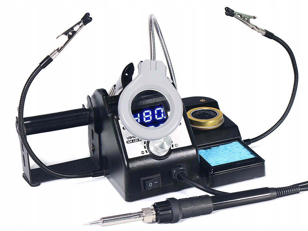 Wraz z dużą lupą umieszczoną na elastycznym wysięgniku z wbudowanym oświetleniem 6x LED, otrzymujemy stanowisko do napraw lutowniczych małych elementów.