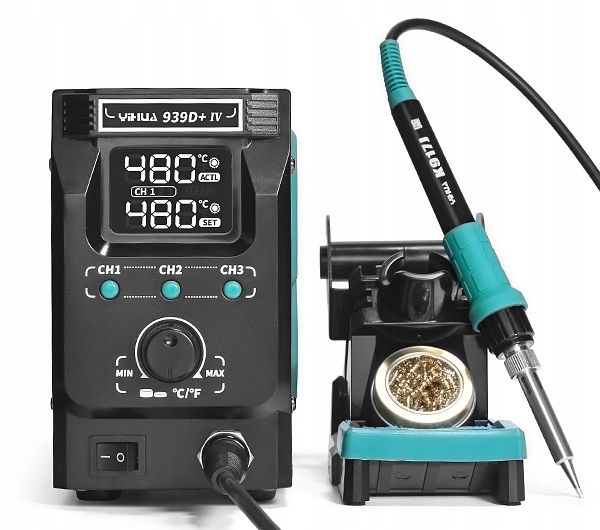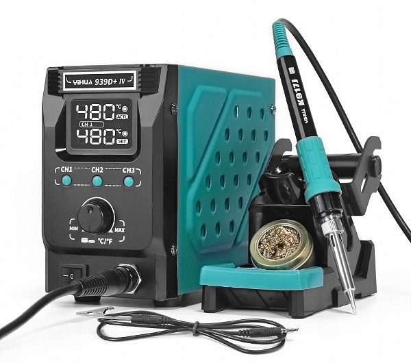 YIHUA 939D+-IV 120W to stacja lutownicza z płynną regulacją temperatury w zakresie od 200°C do 480°C oraz stabilizacją temperatury, wyświetlaczem LCD jak i trzema programowalnymi kanałami pracy.