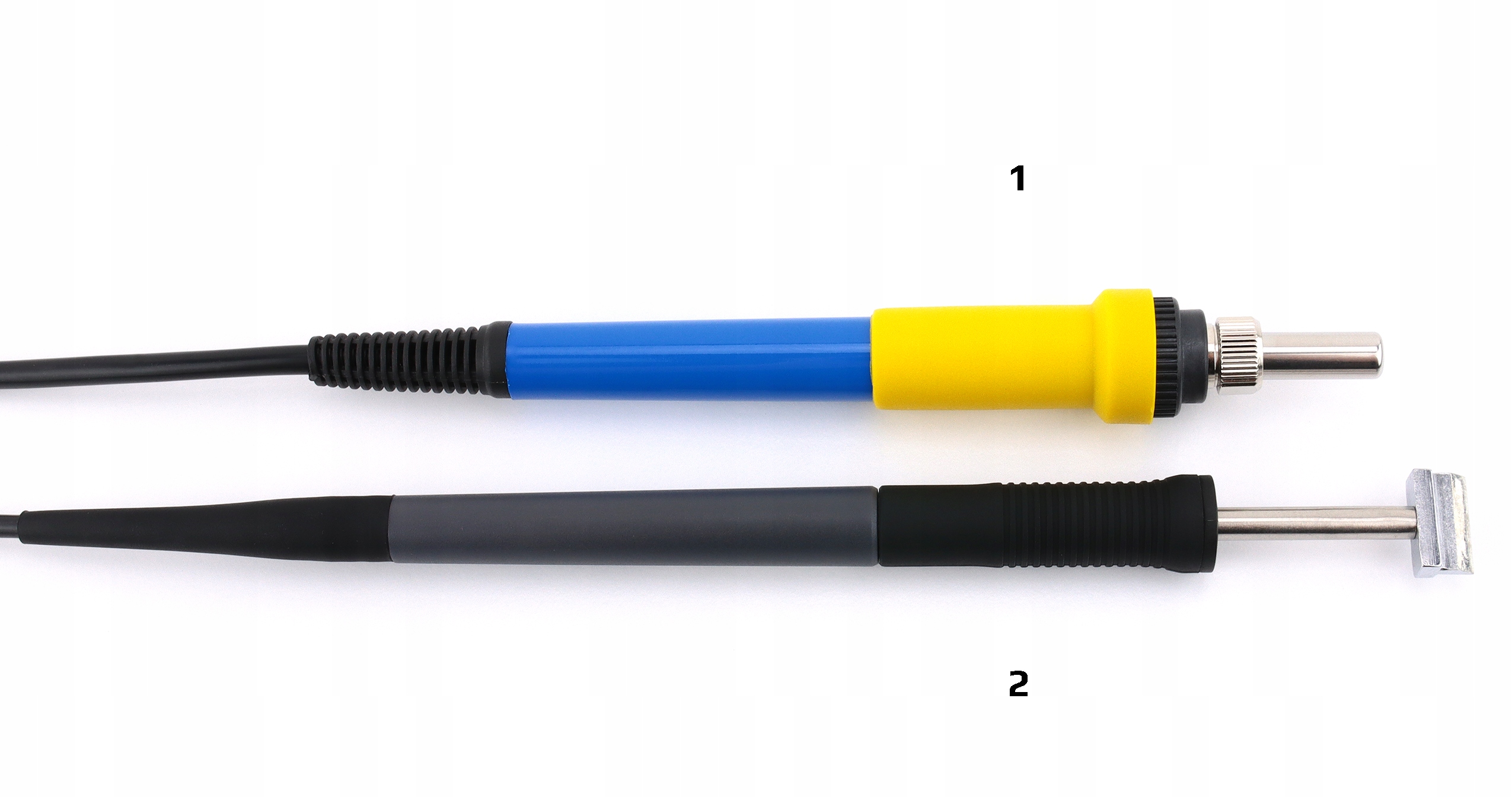 Porównanie kolby stacji OSS TEAM T12-X PLUS (2) z innymi stacjami T12-X (1). Tylko kolba stacji OSS TEAM T12-X oraz OSS TEAM T12-X PLUS pozwala na montaż grotów szpatułkowych T12-1401, T12-1402, T12-1403, T12-1404, T12-1405, T12-1406.