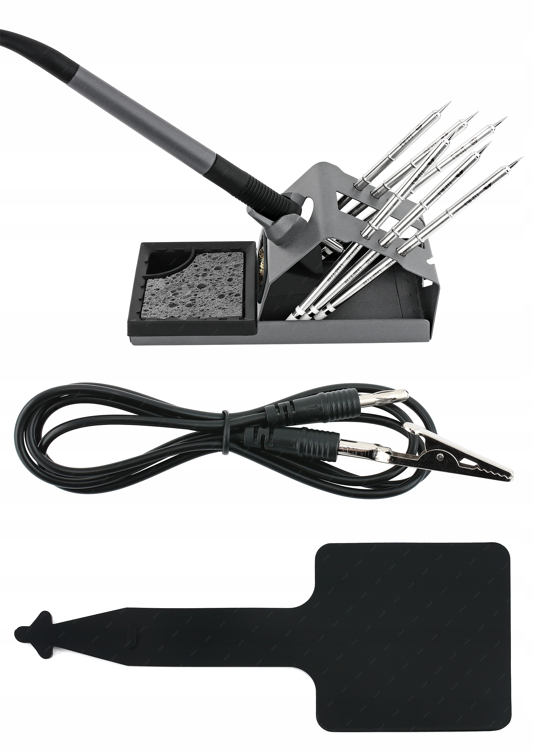 W zestawie znajdują się również miedziany czyścik i gąbka do czyszczenia grotów oraz praktyczna podstawka do kolby która umożliwia przechowywanie 6 zapasowych grotów T12. W skład zestawu wchodzi tylko jeden grot T12-BLS.
