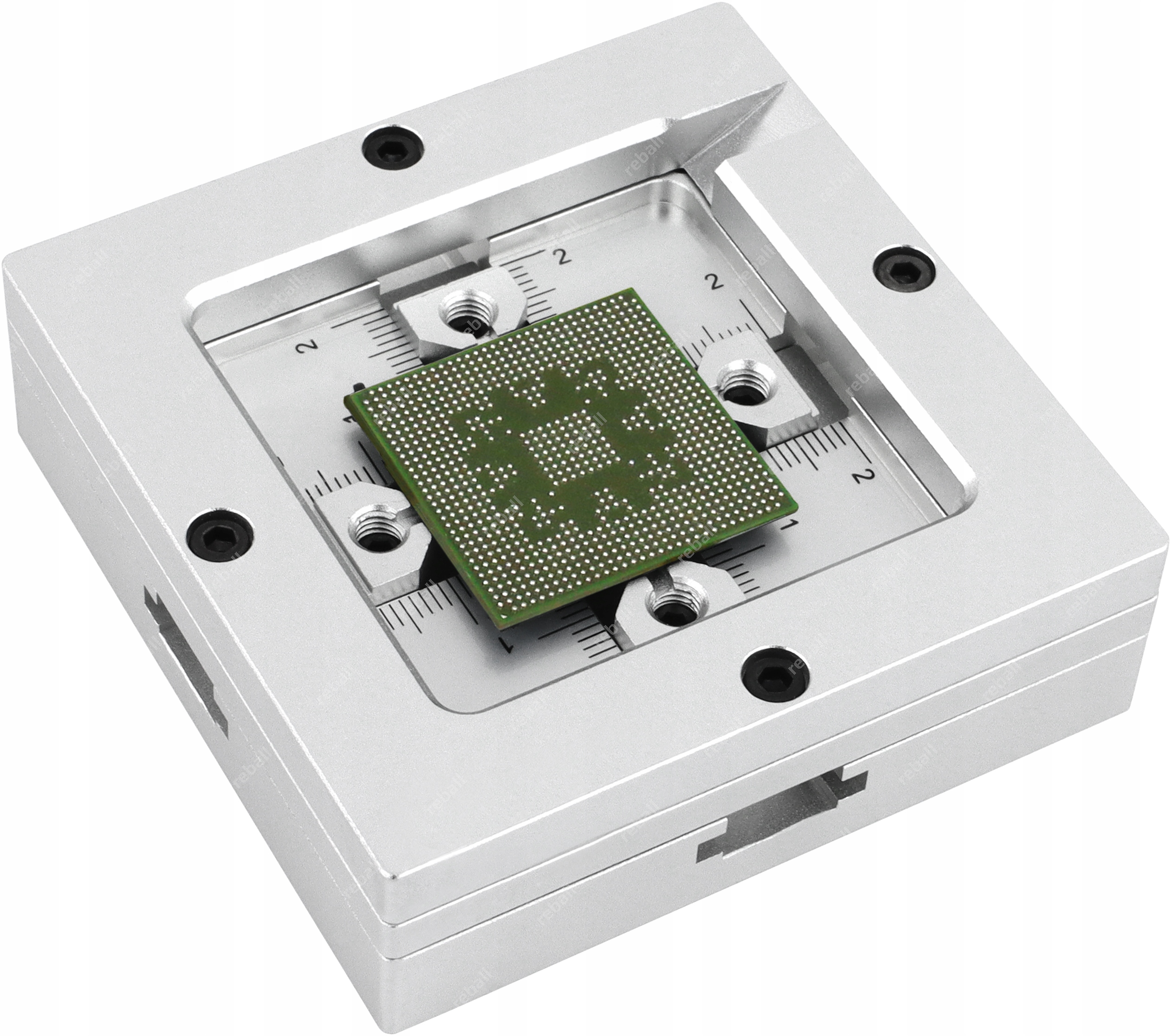 Stacja posiada wygodny system mocowań dla układów oraz sit co gwarantuje że podczas procesu reballingu całość się nie odkształci a kulki będą przylegać równomiernie na całej powierzchni układu.