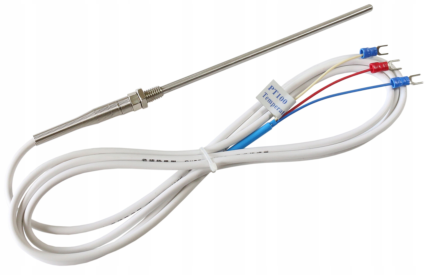 Czujnik temperatury PT100 umieszczony wewnątrz osłony ze stali nierdzewnej zakończonej gwintem M8 z przewodem o długości 2m.