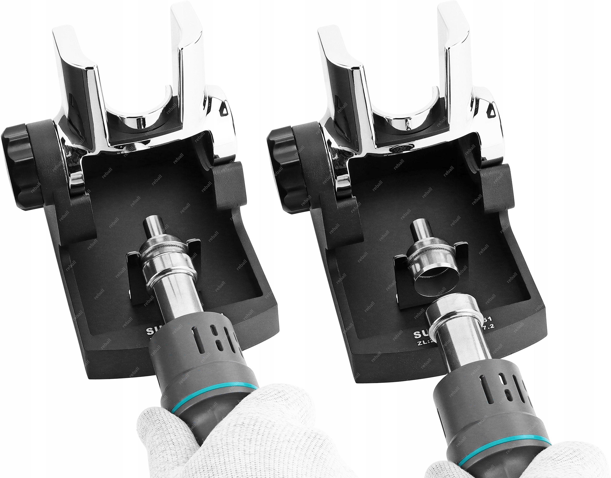 Poniżej znajdują się przykładowe ilustracje przedstawiające instalowanie dyszy w kolbie za pośrednictwem zintegrowanego ze stacją uchwytu oraz dołączonej podstawki pod kolbę.