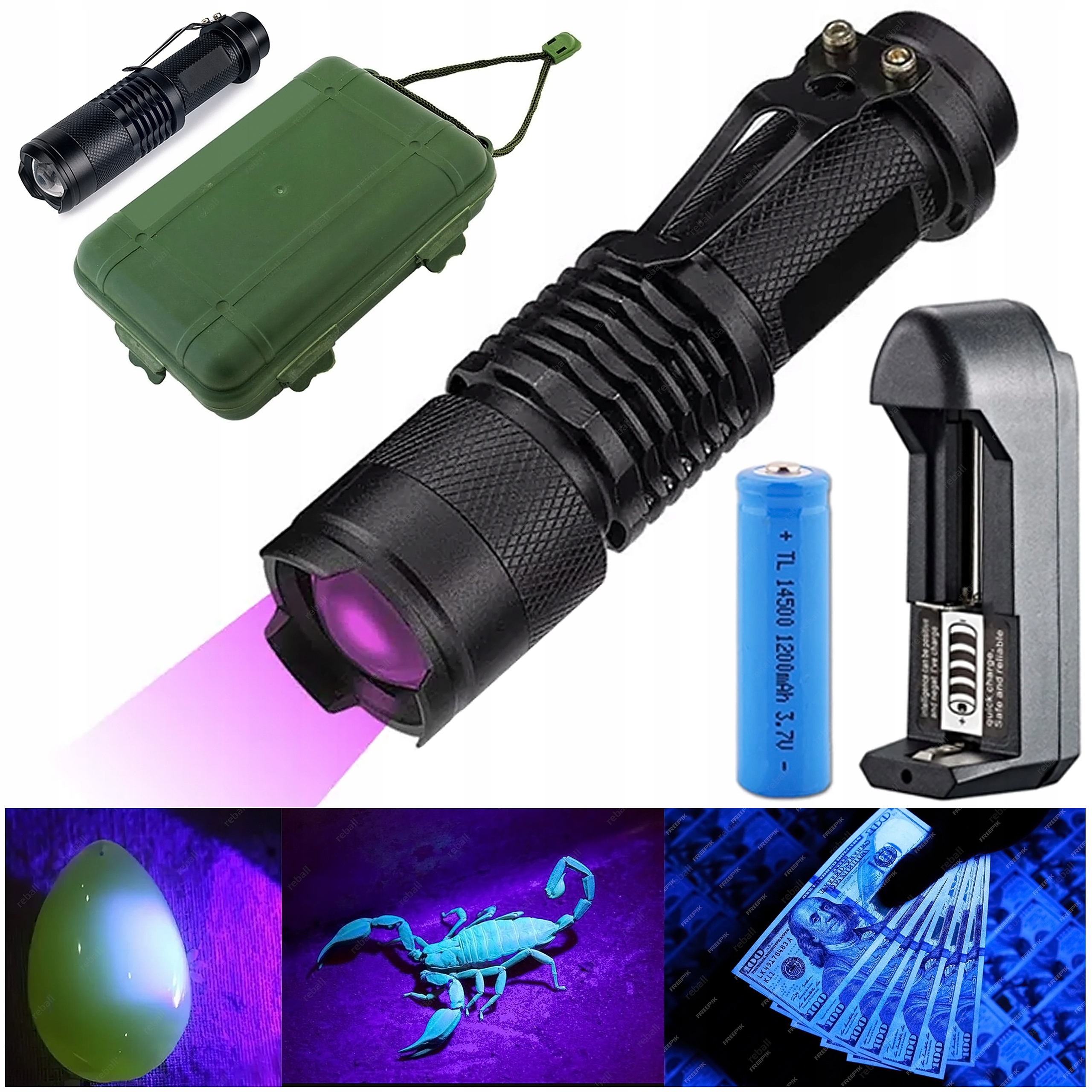 LATARKA LED UV 5W 395nm ZESTAW SURVIVALOWY W ETUI + AKUMULATOR + ŁADOWARKA
