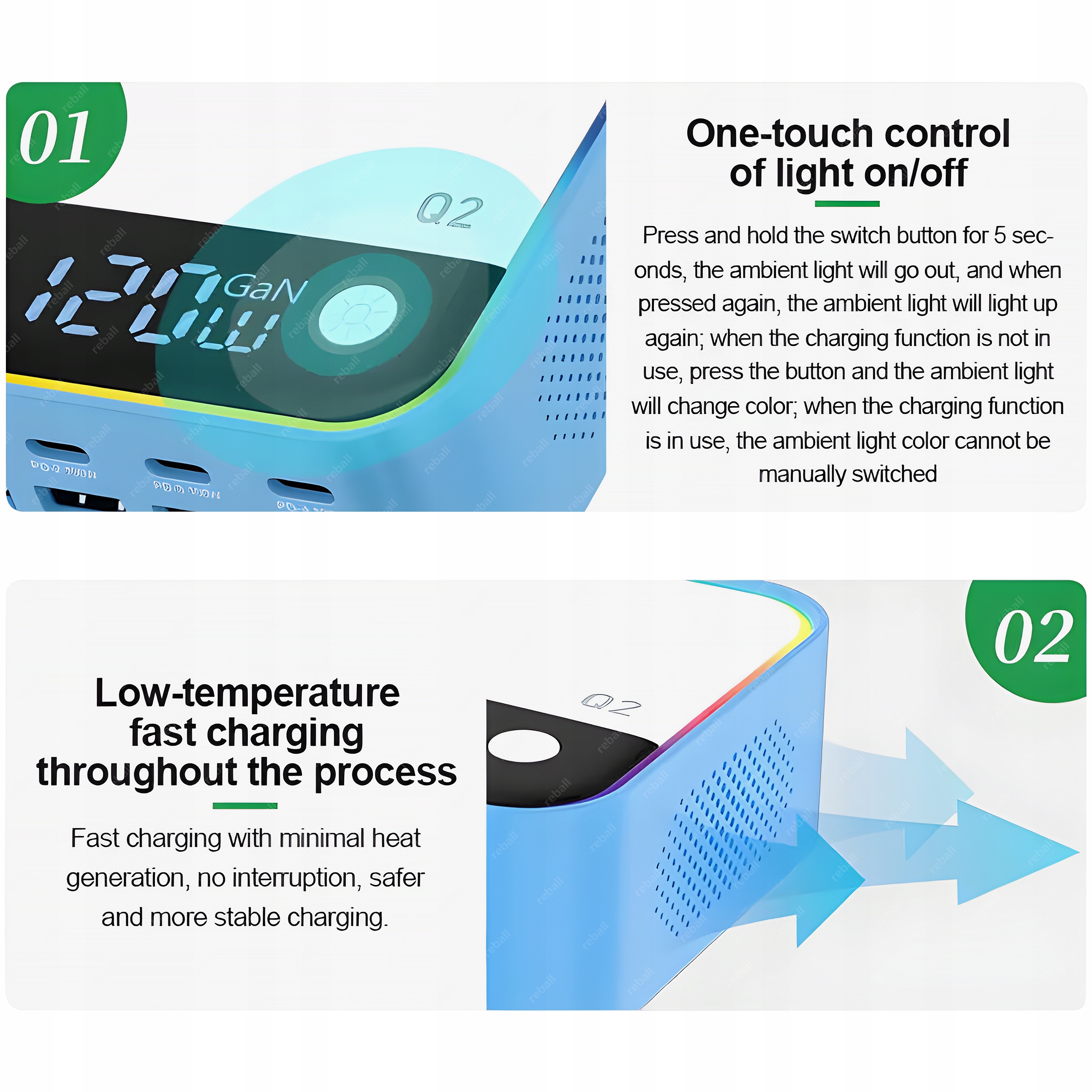 Relife Q2 to nowoczesna ładowarka o wysokiej mocy 120W, stworzona z myślą o jednoczesnym ładowaniu wielu urządzeń – smartfonów, tabletów, laptopów i akcesoriów.