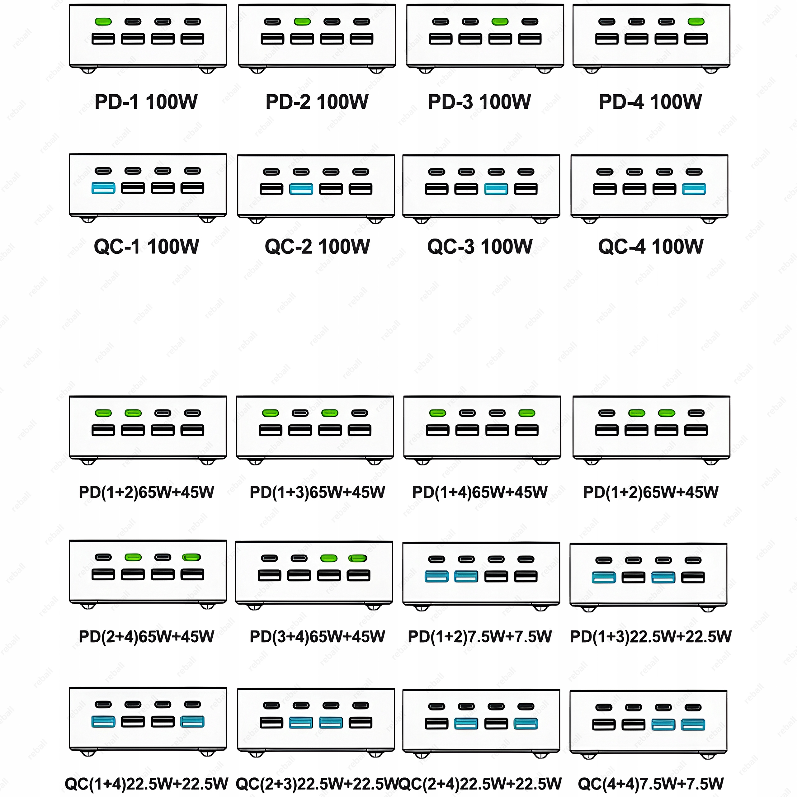 ✅ Ładowanie 8 urządzeń jednocześnie – 8 portów: 4 x USB-C PD (do 100W) i 4 x USB-A QC (do 22,5W)