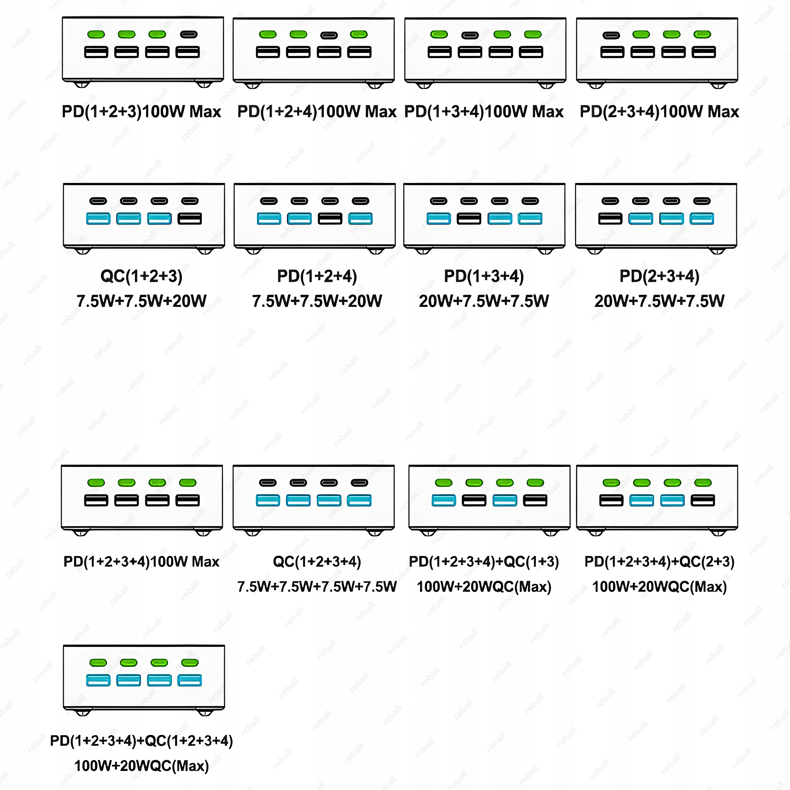 ➡️ Porty USB-C PD (1/2/3/4): 5V3A, 9V3A, 12V3A, 15V3A, 20V5A (max 100W) – PPS: 3.3-21V 5A