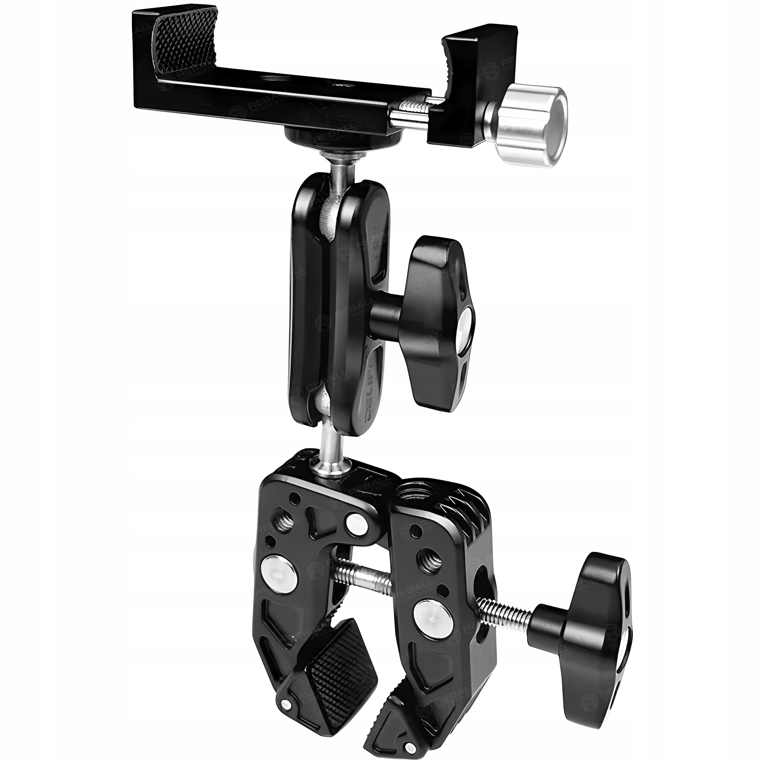 Uchwyt wielokierunkowy przeznaczony do stabilnego mocowania telefonów, tabletów, kamer oraz różnych akcesoriów pomocniczych.