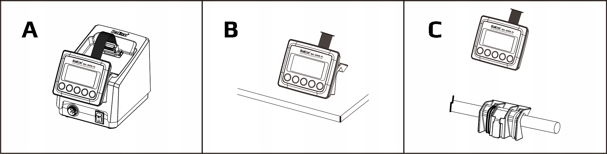 Dzięki wieszakowi wyświetlacza LCD stacja lutownicza BAKON BK-999N nabiera nowego znaczenia. Dzięki niemu możemy postawić wyświetlacz na blacie/stole a także zawiesić go na przodzie obudowy w skutek czego otrzymujemy idealne położenie wyświetlacza podczas wykonywania napraw elektroniki. Stacja lutownicza staje się jeszcze bardziej mobilna i funkcjonalna.