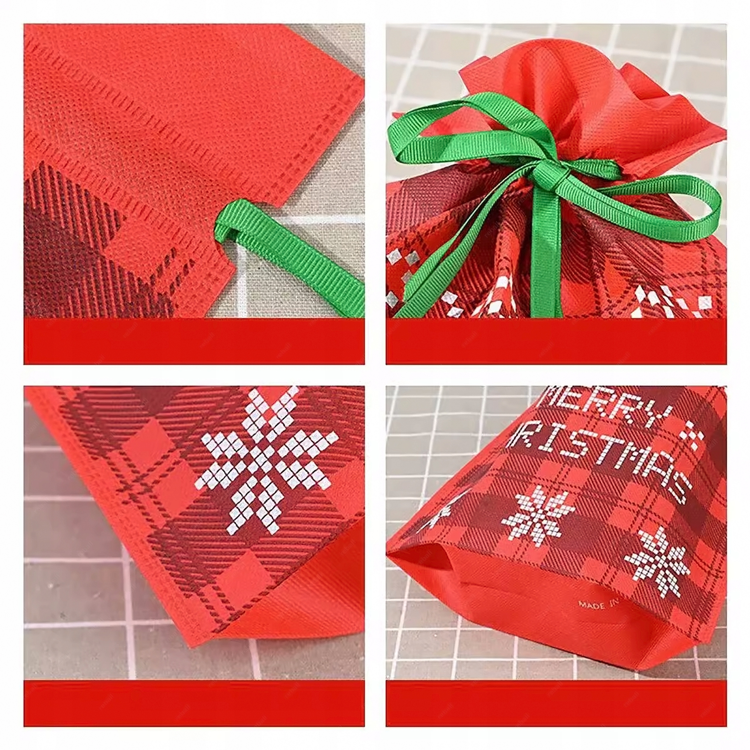 Zewnętrzna warstwa worka ozdobiona jest świąteczną grafiką. Kolorystyka nawiązuje do tradycyjnych barw świąt, głównie czerwieni i zieleni, nadając workowi elegancji.