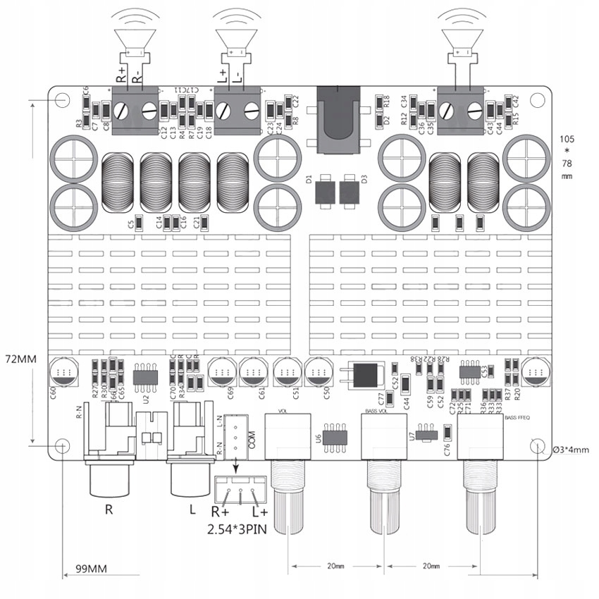 Konstrukcja wzmacniacza mocy oparta została o układy TPA3116 produkcji Texas Instrument: