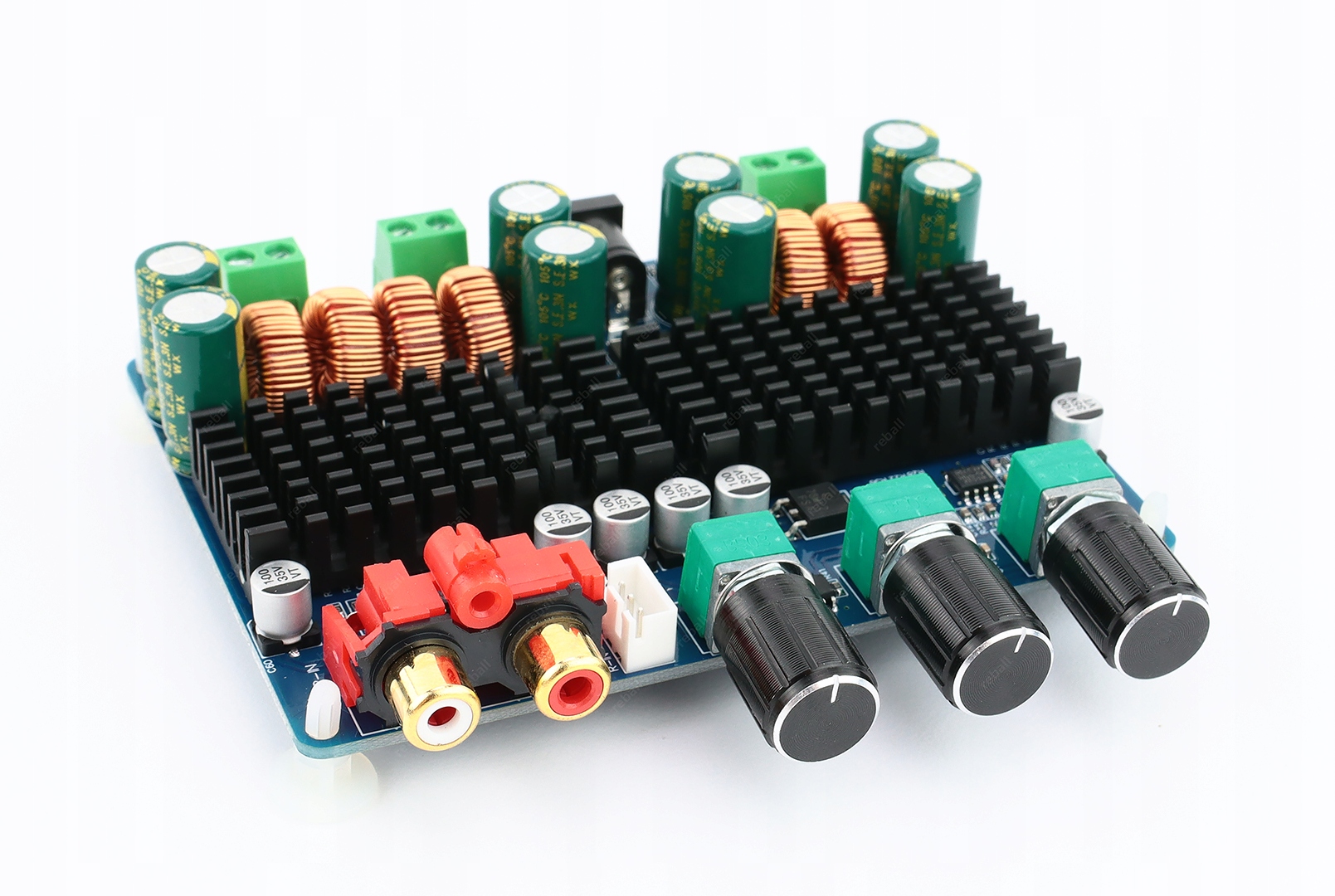 Płytka wzmacniacza jest wyposażona w obwód przedwzmacniacza (regulacja głośności potencjometrem) i filtr aktywny dla głośnika niskotonowego basowego (regulacja potencjometrami wzmocnienia basów i częstotliwości odcięcia).