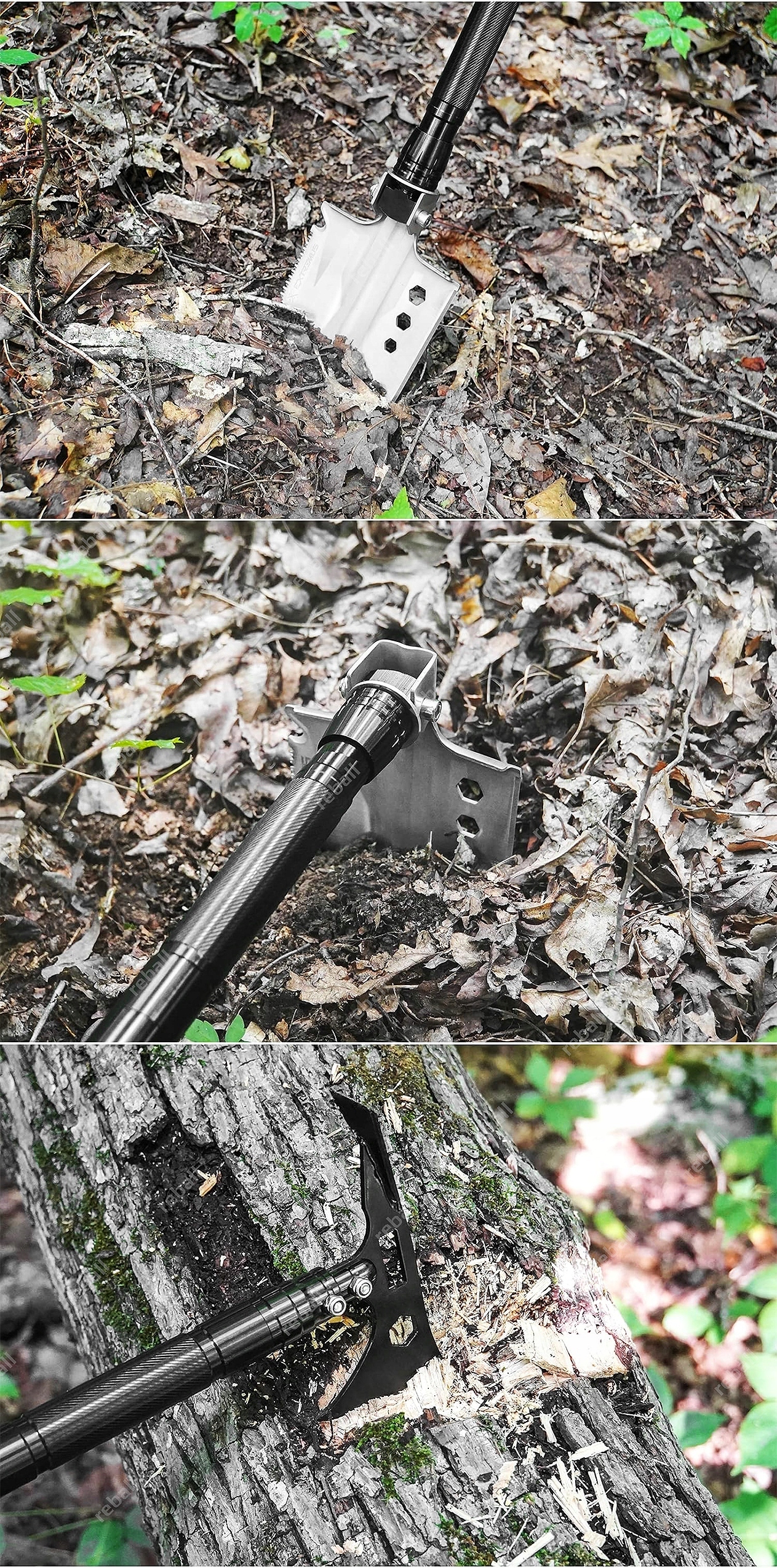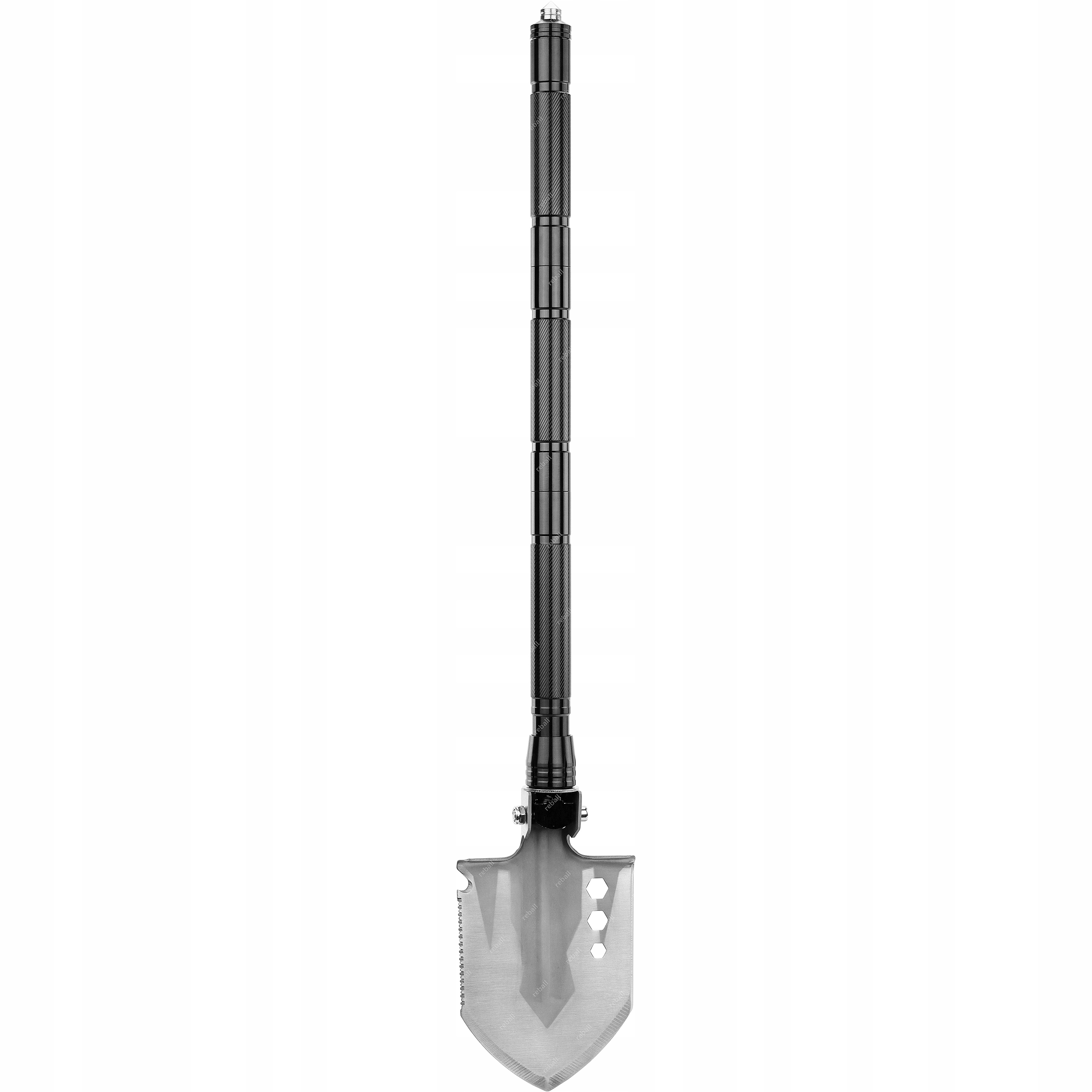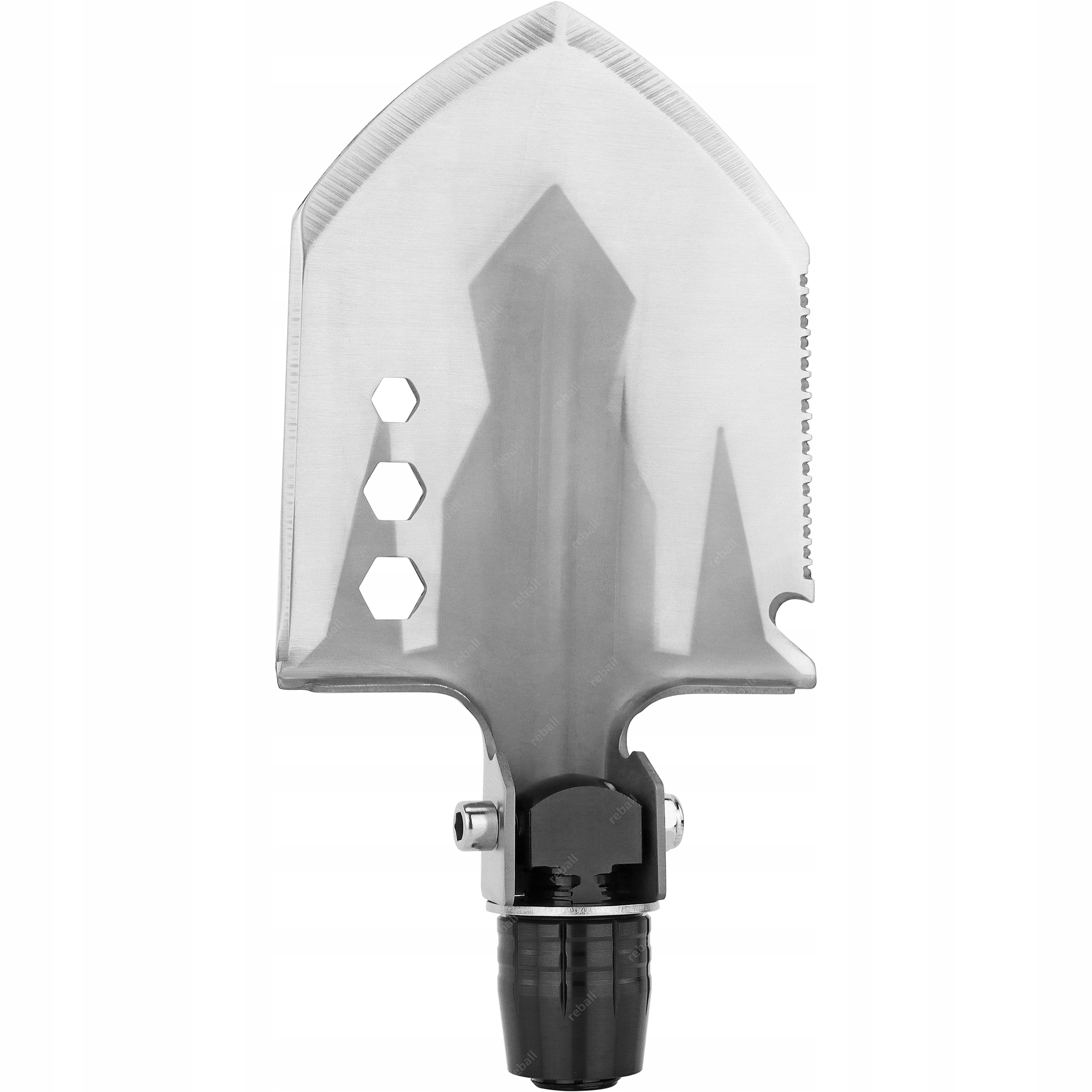 Korpus saperki wykonany został ze stali nierdzewnej o wyjątkowej wytrzymałości, gwarantując niezawodność nawet w najbardziej wymagających warunkach. Trzonek z aluminium łączy lekkość z wytrzymałością, a ergonomiczna rękojeść z trzech skręcanych rur zapewnia komfort i pewny chwyt podczas użytkowania. Po rozłożeniu saperki, szpadel blokowany jest solidnym trzpieniem, co zapewnia stabilność podczas pracy.