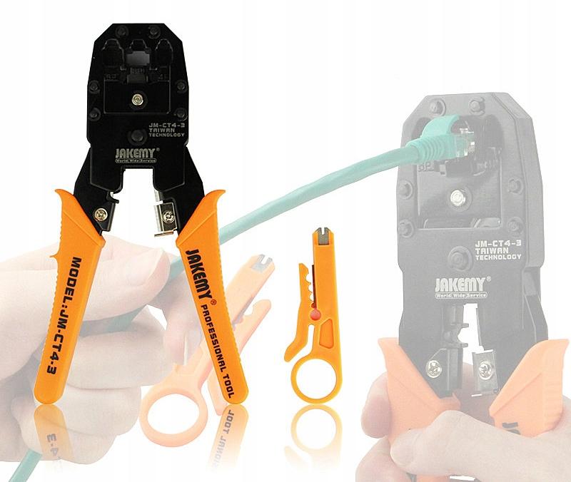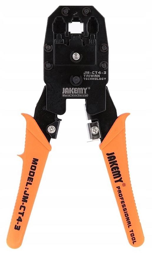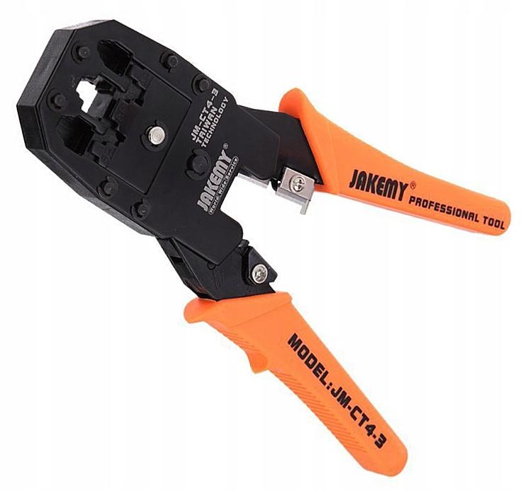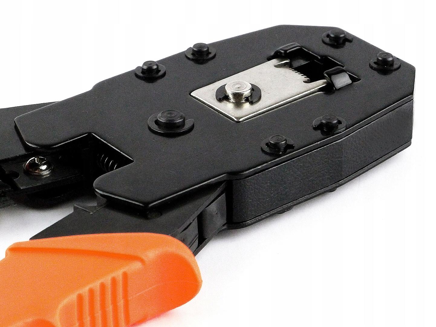 Profesjonalna zaciskarka wtyków modularnych, służąca do zaciskania na przewodzie wtyków 8 pinowych (np. komputerowych) oraz 6 pinowych i 4 pinowych (np. telefonicznych).