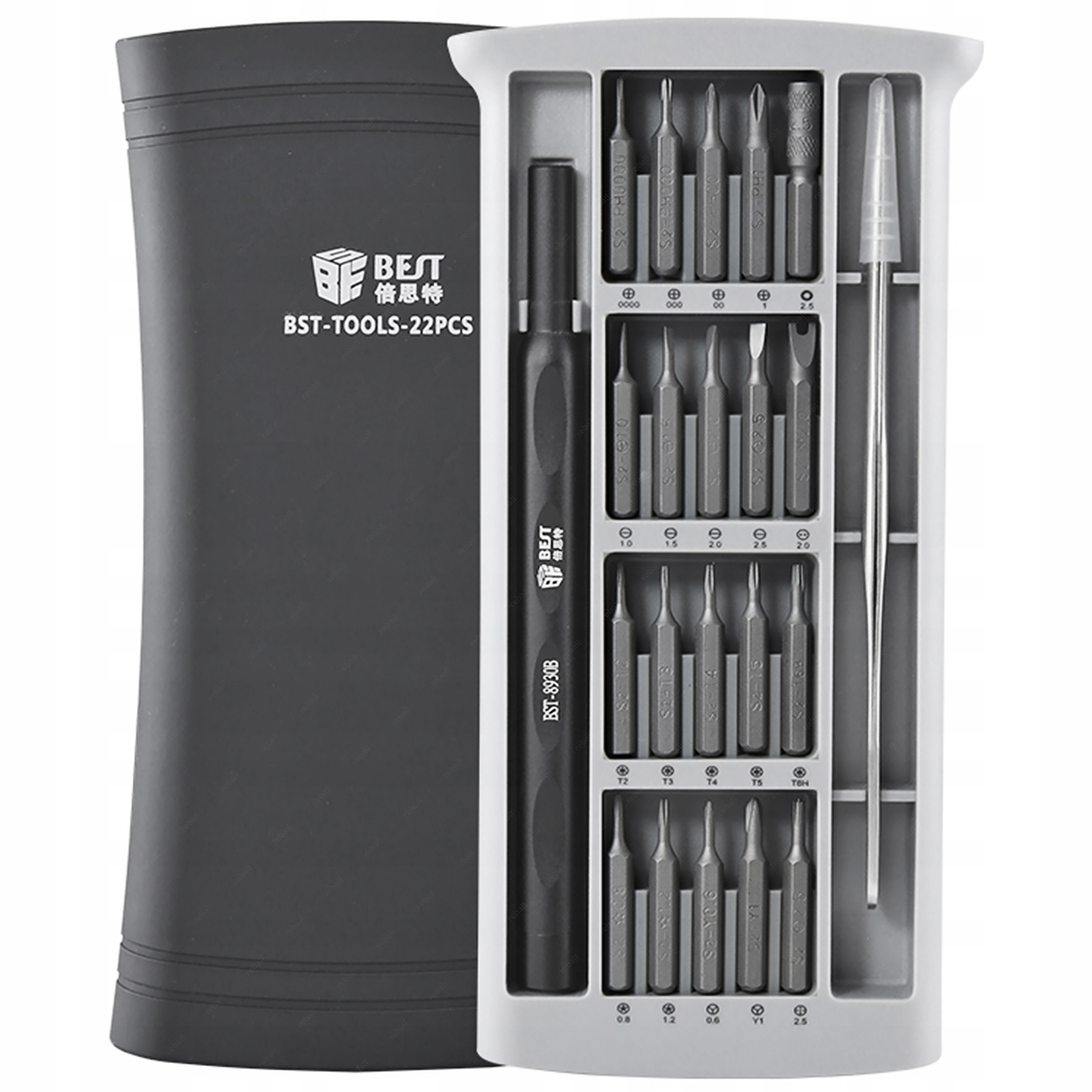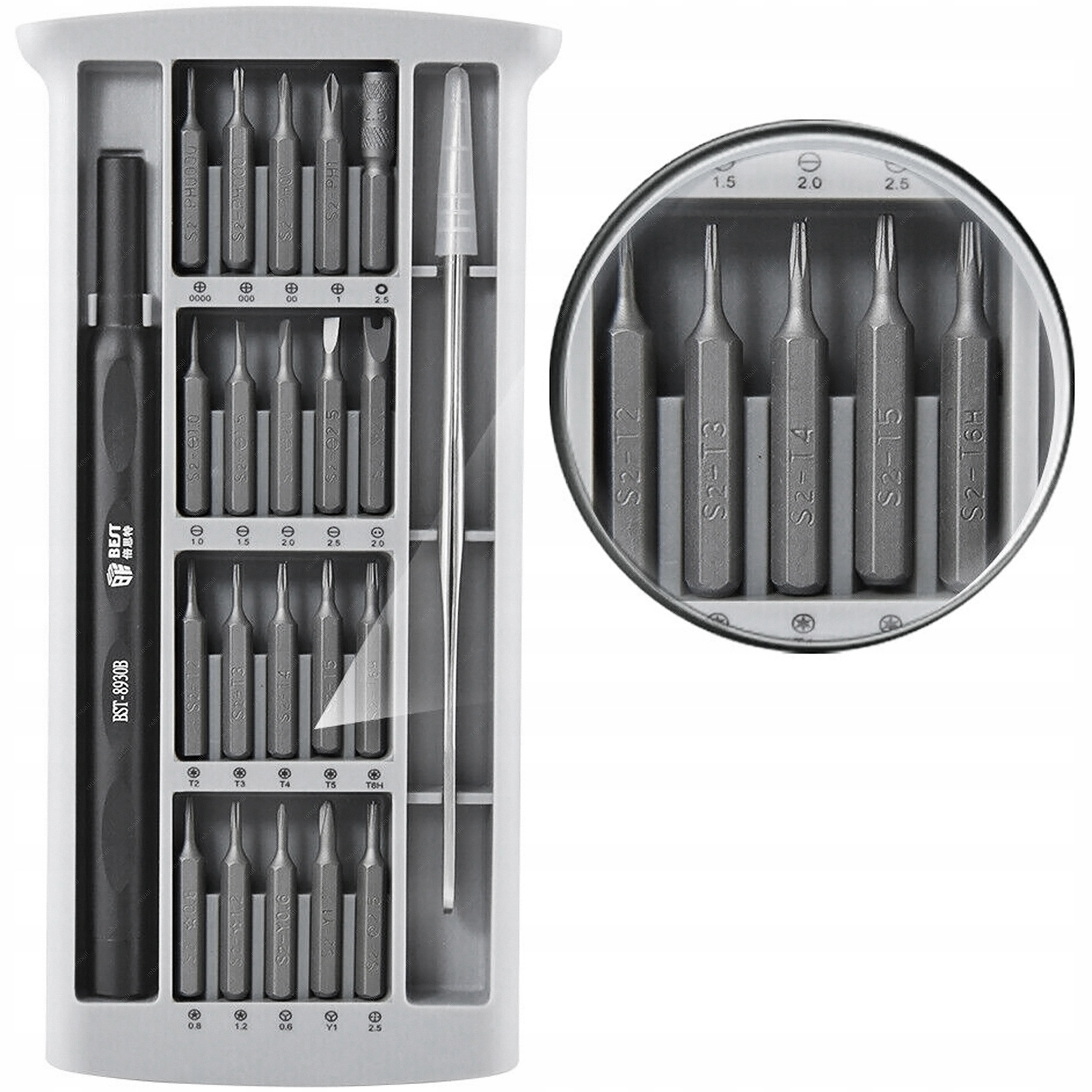 BEST BST-8930B to zestaw 20 magnetycznych bitów z aluminiowym uchwytem przeznaczony do precyzyjnych napraw serwisowych telefonów i smartfonów w tym produktów Samsung, Huawei, Xiaomi, Oppo oraz Apple tj iPhone, MacBook Air i Pro.