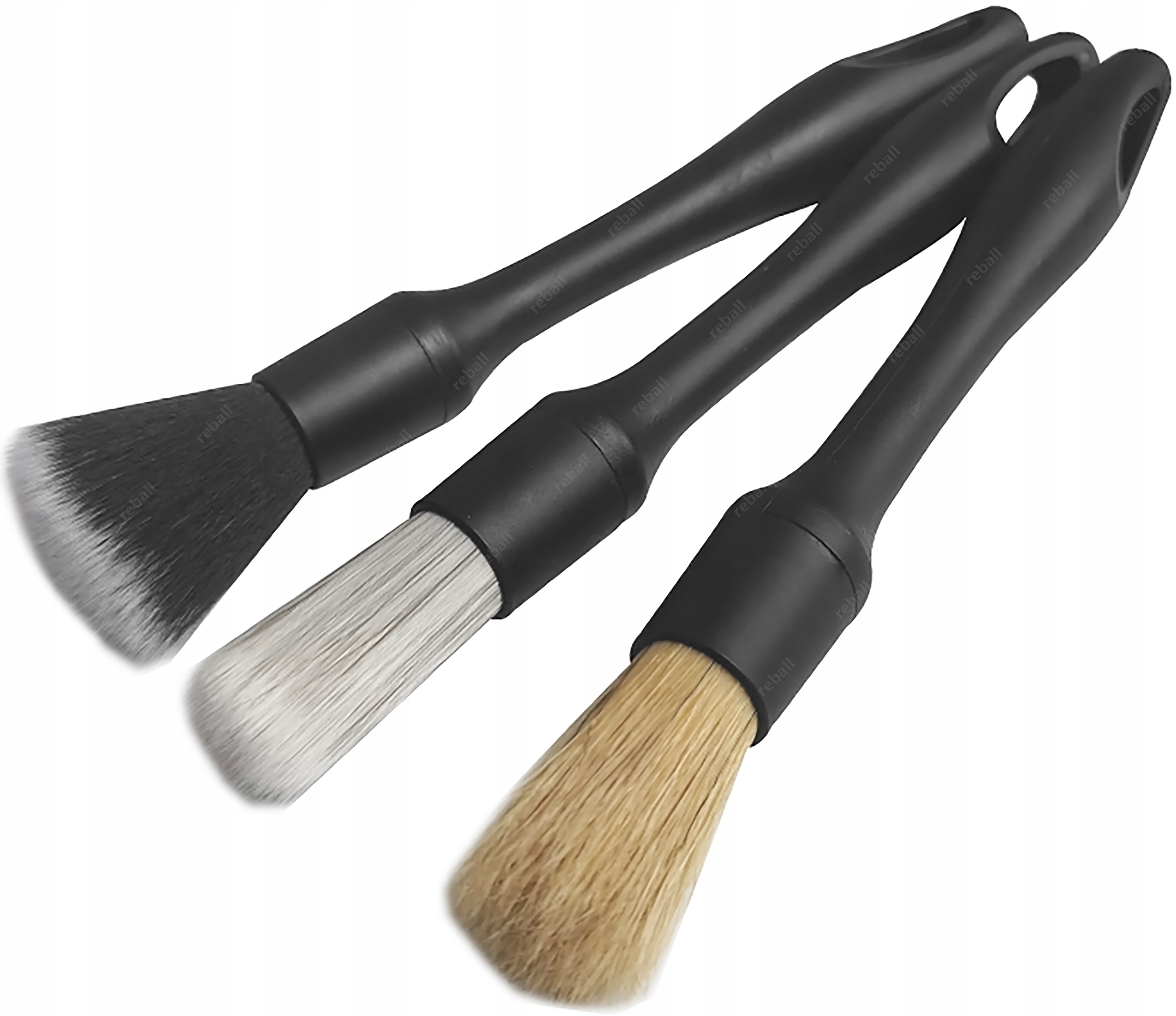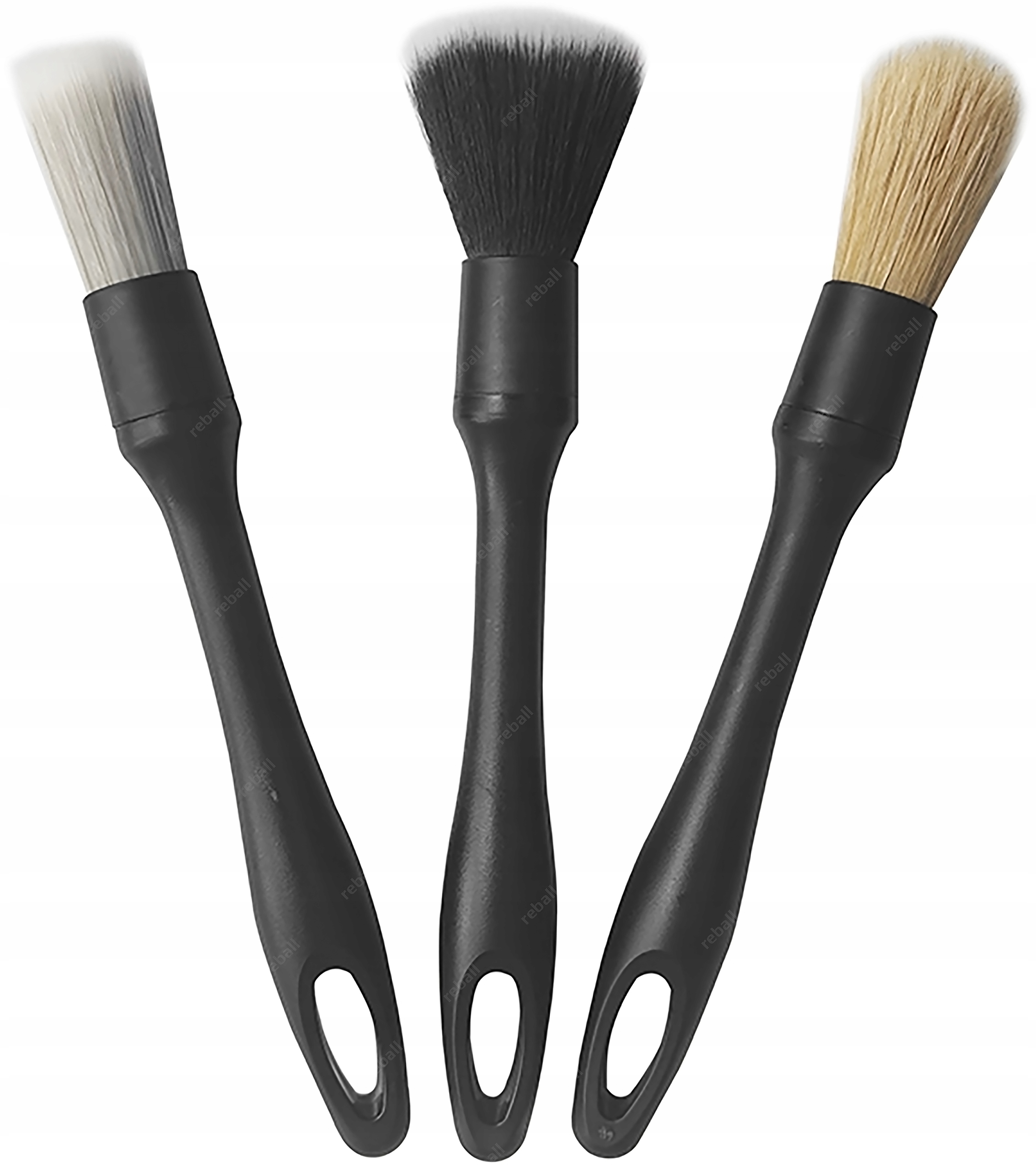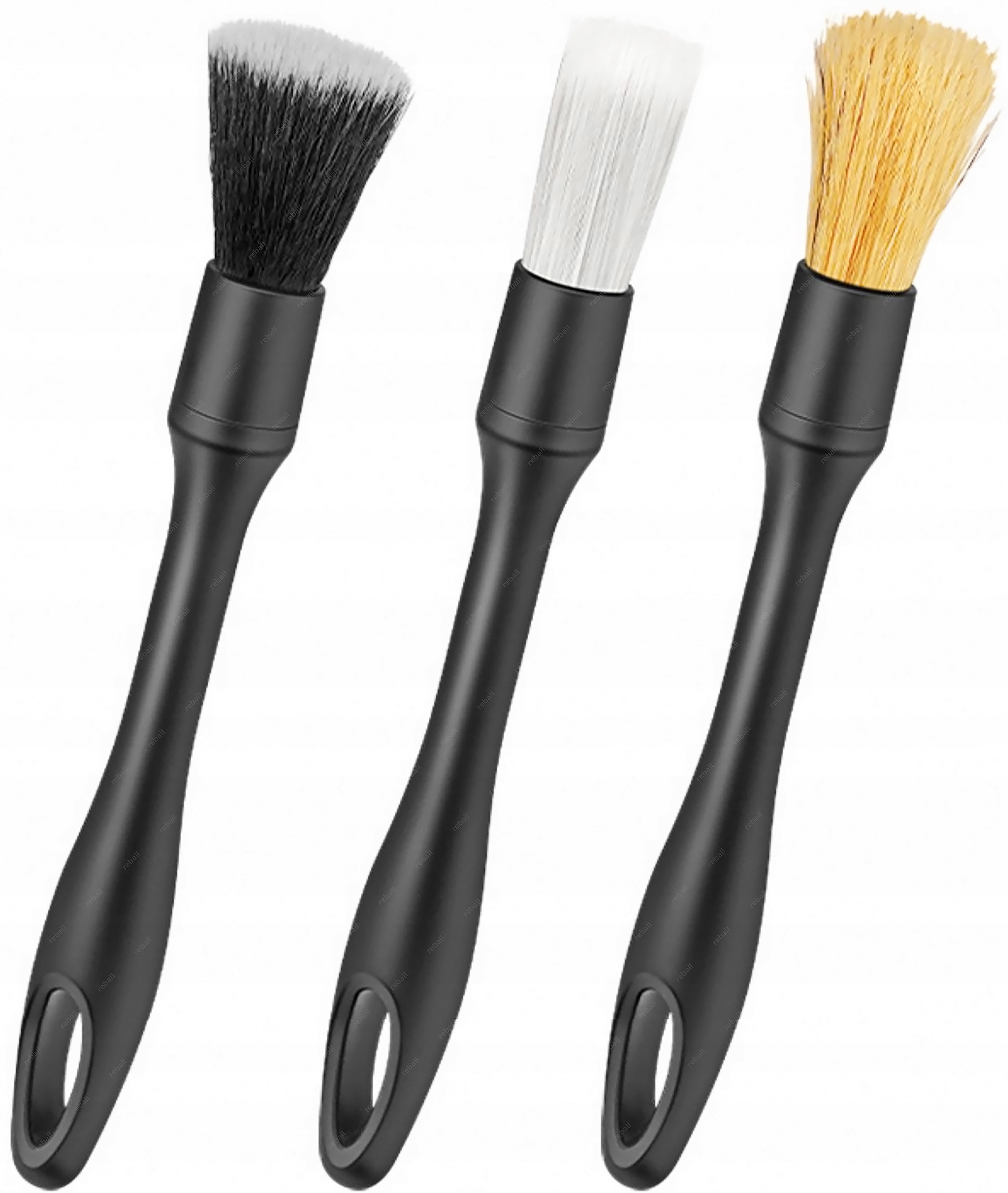Podstawowy zestaw do detailingu składający się z trzech szczotek o różnym włosiu przeznaczonymi do precyzyjnego czyszczenia wewnątrz samochodu.