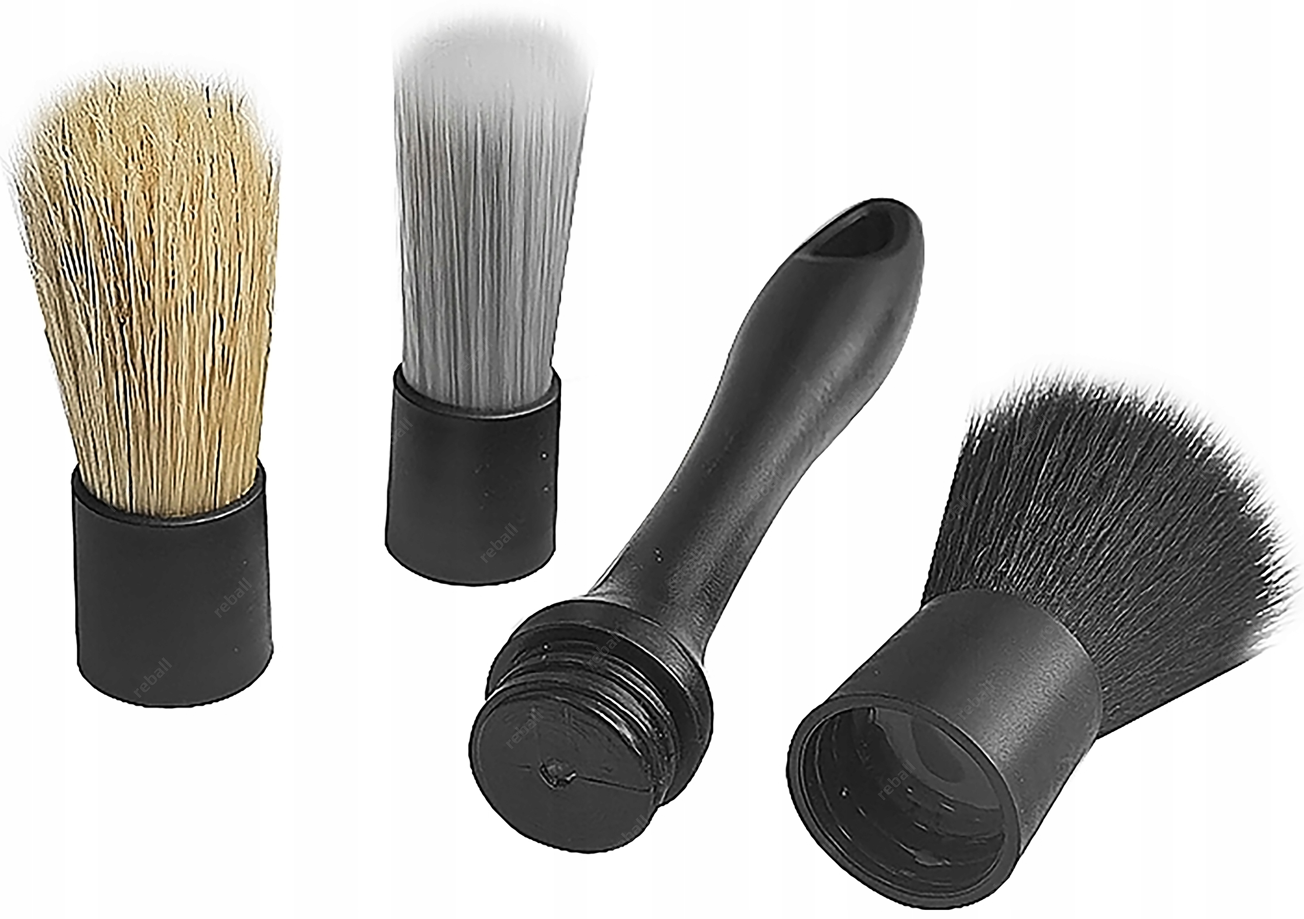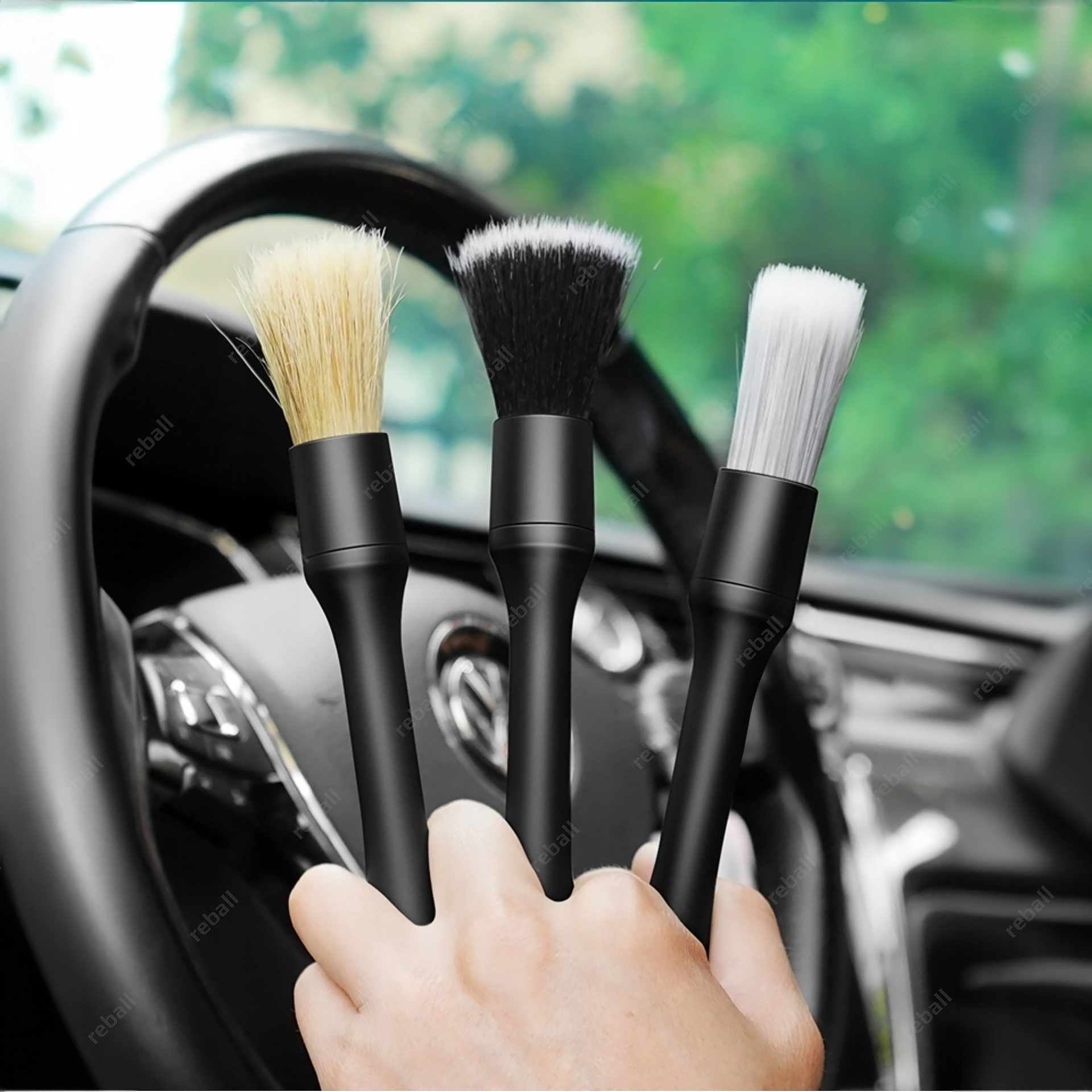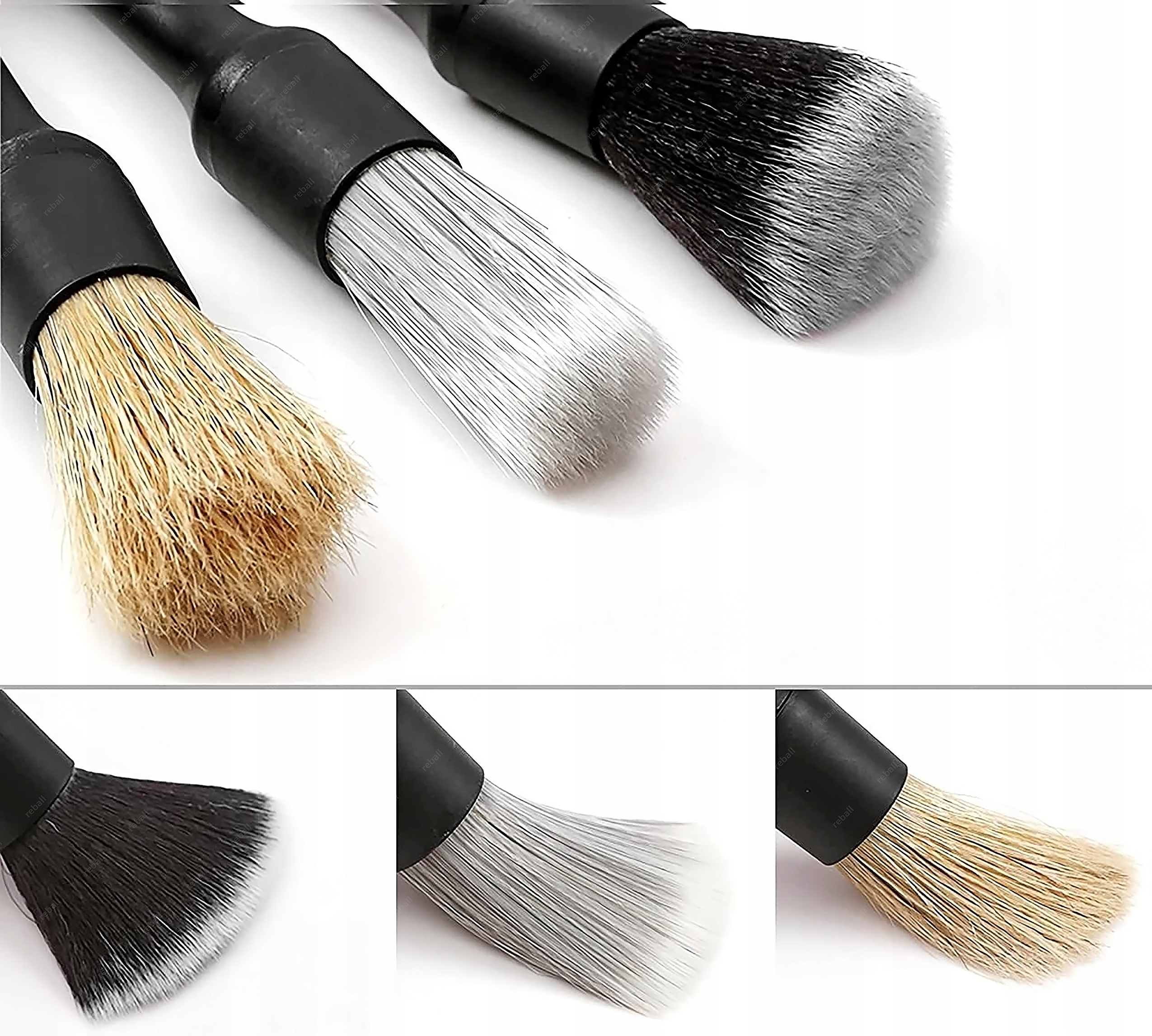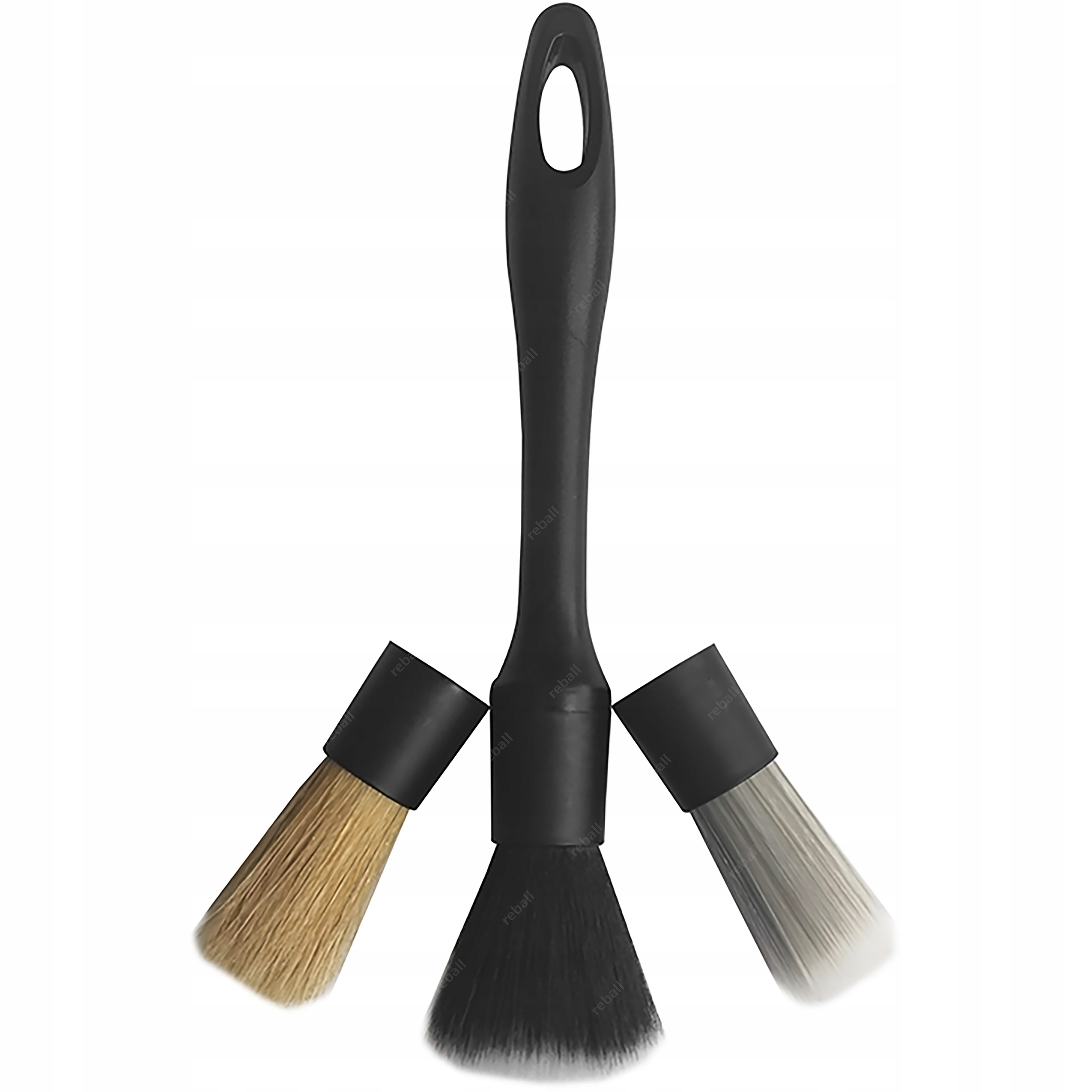 Podstawowy zestaw do detailingu składający się z trzech szczotek o różnym włosiu przeznaczonymi do precyzyjnego czyszczenia wewnątrz samochodu.