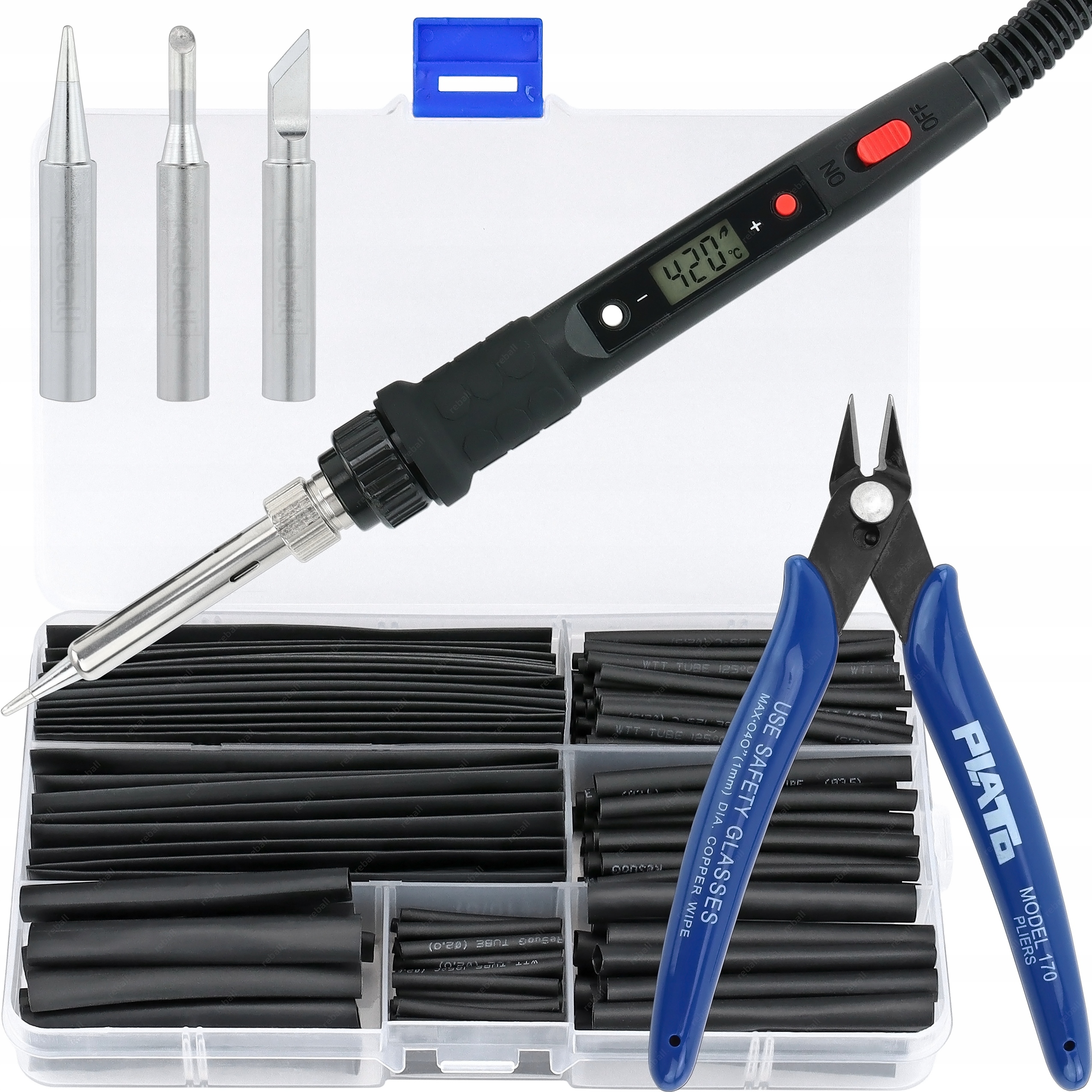 UNIWERSALNY ZESTAW LUTOWNICA KOLBOWA S801A 80W, GROTY 900M, SZCZYPCE PLATO 170, KOSZULKI TERMOKURCZLIWE