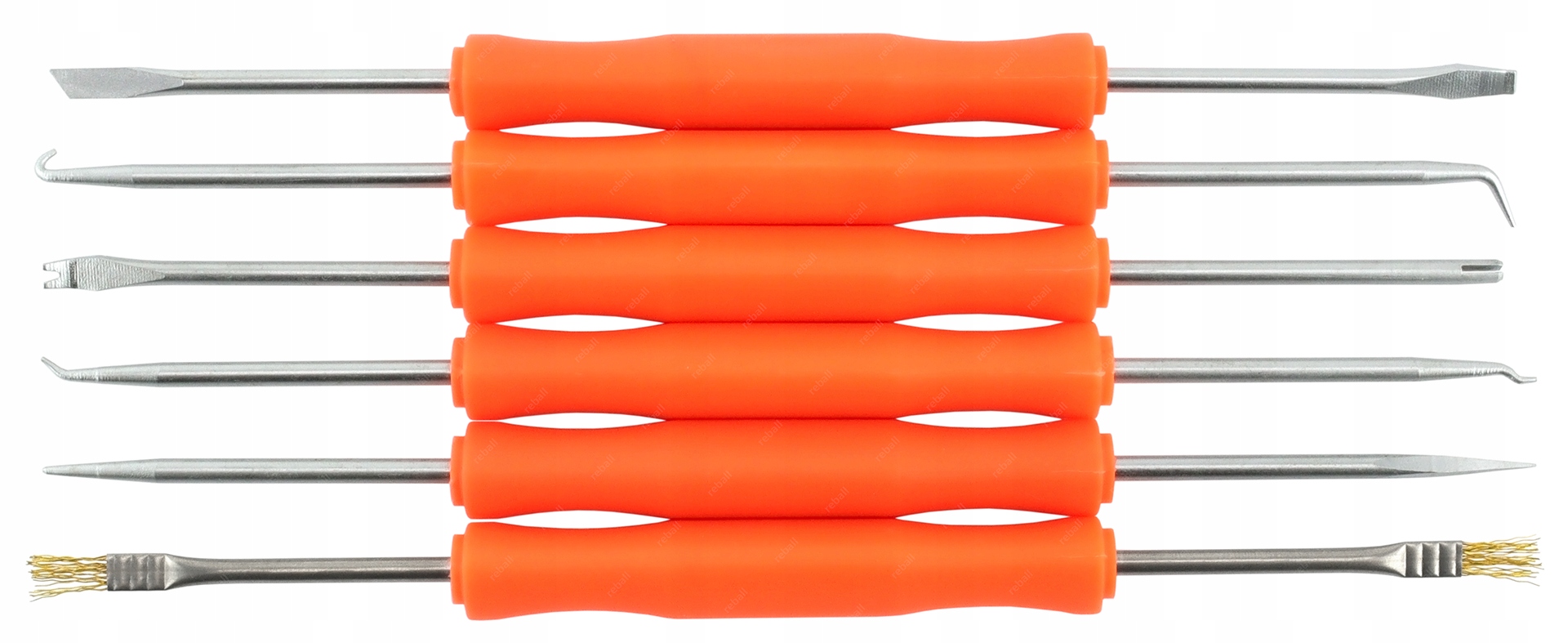W zestawie pędzelek do czyszczenia, różnorodne skrobaki, wybijaki, haczyki oraz narzędzia do podważania i podtrzymywania.